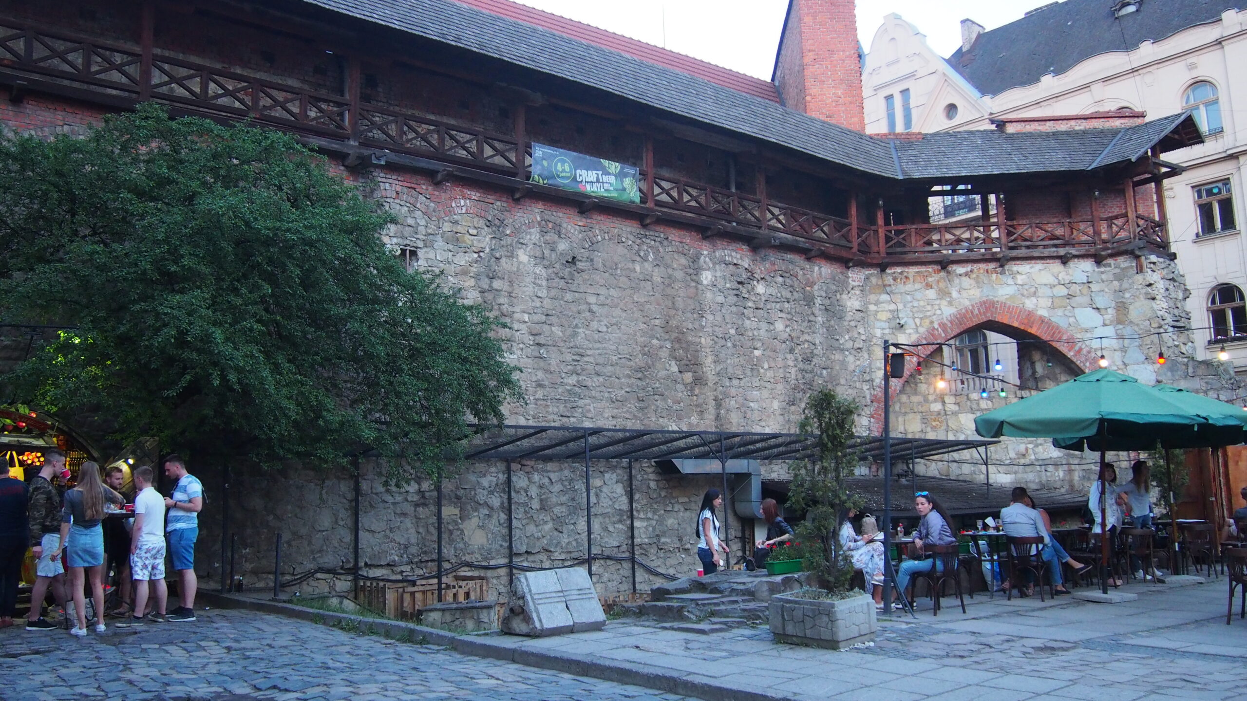 Zaraz obok jest kolejne ciekawe miejsce. To placyk przy nieistniejącej już synagodze „Złota Róża”. Mamy tutaj budkę z „pijanymi wiśniami” (co warto spróbować) oraz restaurację i piekarnię, gdzie obok pieczywa można zjeść pstrąga i sporo innych pozycji, ale właśnie z bagietek, pieczywa i pstrąga miejsce to jest znane. Wieczorami codziennie pojawia się na murach trębacz i odgrywa kilka standardów na trąbce (kilka jazzowych i „tylko we Lwowi”). Przyjemna atmosfera, dobre jedzenie i obsługa, pijane wiśnie i można czekać, aż na kamienicy obok (Dom Dziwów) pojawi się wreszcie wyczekiwany przez Jagodę jeżdżący tramwaj i zionący smok. W drodze powrotnej do domu (czyli w Rynku do kamienicy Wilczków) zahaczaliśmy o losowe miejsca i tak trafialiśmy np. na winiarnię, gdzie za niewielkie pieniądze spróbowaliśmy całkiem niezłego wina – były mołdawskie i ukraińskie.