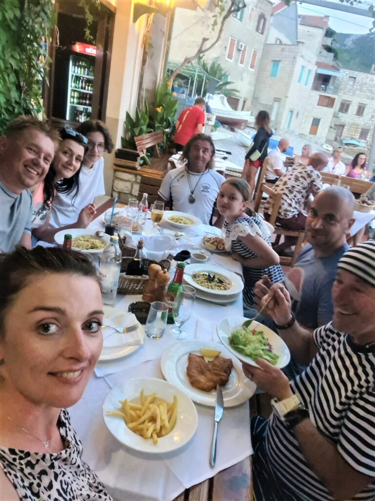Wróciliśmy na jacht pontonem z Mariuszem, żeby się przebrać i ruszyliśmy do restauracji. Część z nas poszła pieszo z plaży już do restauracji i dała nam znać, że jest miejsce w Konoba Bako do której mogliśmy przycumować pontonem.