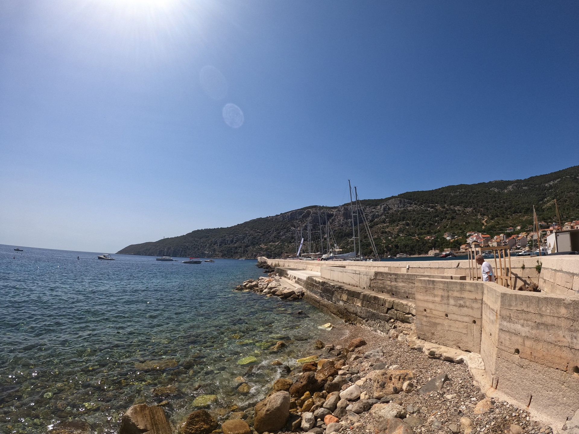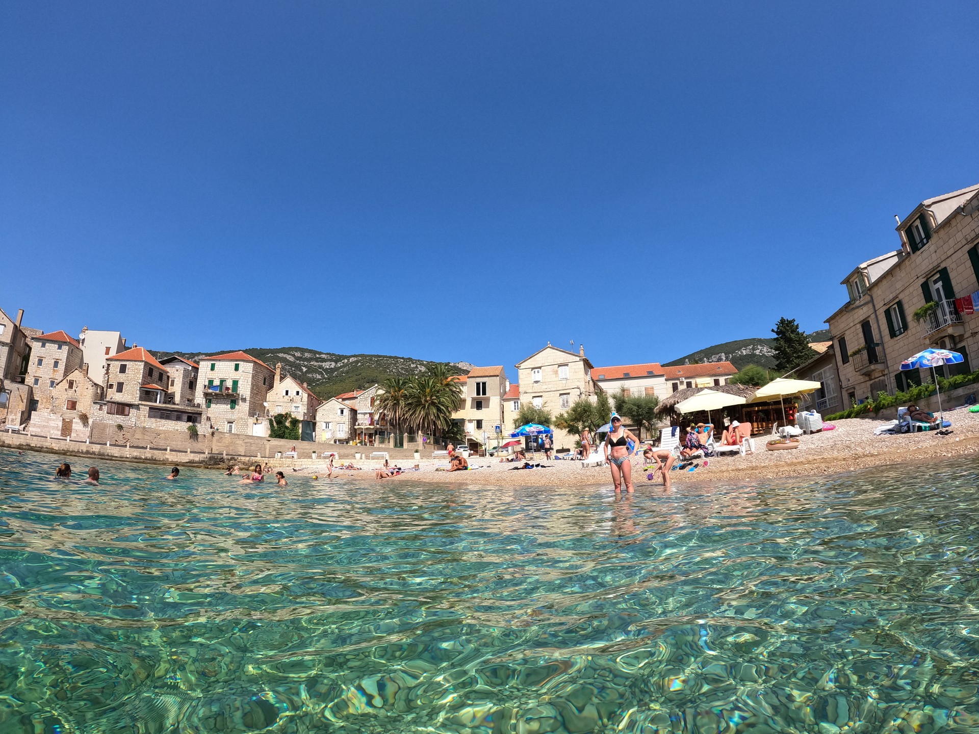 Ponieważ przyjemnie upływał nam czas na tej plaży i w zacienionym barze z możliwością skorzystania z kibelka nieopodal, to zabawiliśmy tutaj dłużej. Spotkaliśmy jeszcze na plaży Polską rodzinę nauczycieli z dziećmi, którzy co roku spędzają całe długie nauczycielskie wakacje na wyspie Hvar, gdzie mają swój domek. Dzisiaj przyjechali do Komižy żeby trochę zmienić otoczenie. Przyjemnie się z nimi rozmawiało czekając na Mariusza, który przez ten czas odpoczywał na łodzi.