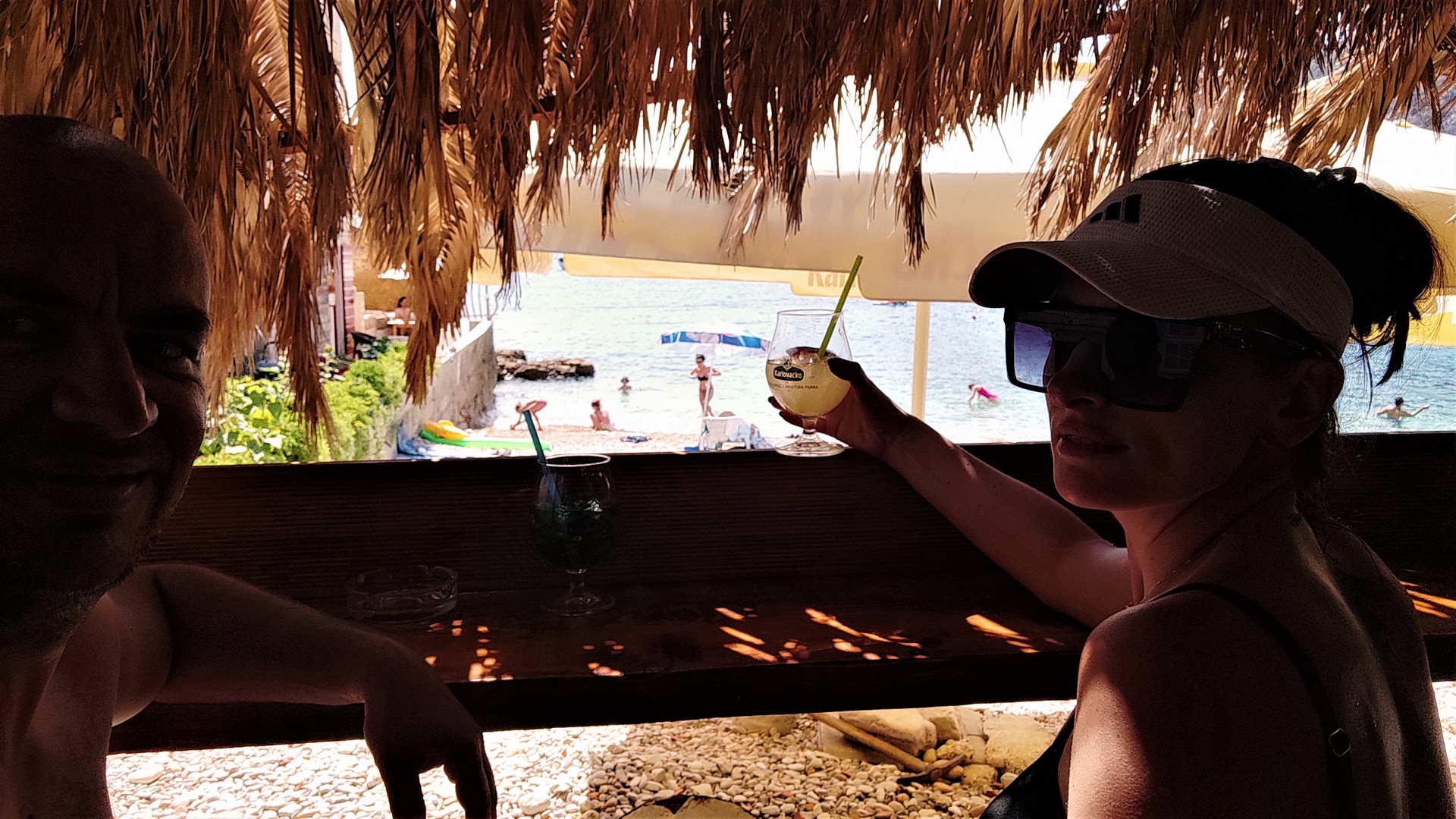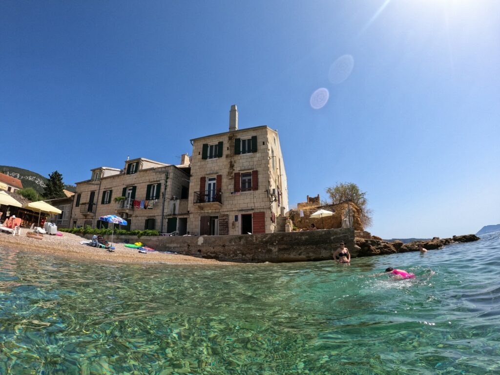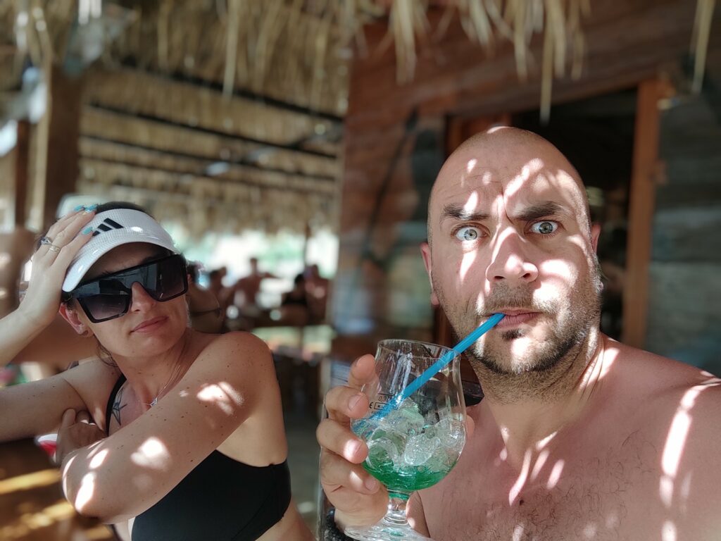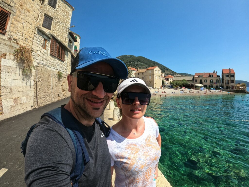 Pontonem, który podwieszony na rufie jest w wyposażeniu naszego katamaranu, popłynęliśmy na plażę w Komižy. Urokliwe miejsce, wioseczka nie za mała, nie za duża. W sam raz dla nas. Przy plaży beach bar w którym spróbowaliśmy z Patką ich wersję Spritza. Marakuja Patki pyszna, ale mój miętowy smakował jakby wlali tam Ludwika do mycia naczyń. Mimo tego Germiš, czyli białe wino z gazowaną mineralną było jak na tą pogodę, czyli pełną lampę i 40° C w cieniu, idealnym drinkiem a przy tym w rozsądnej cenie. Bo ceny w chorwackich barach i restauracjach do niskich nie należą!