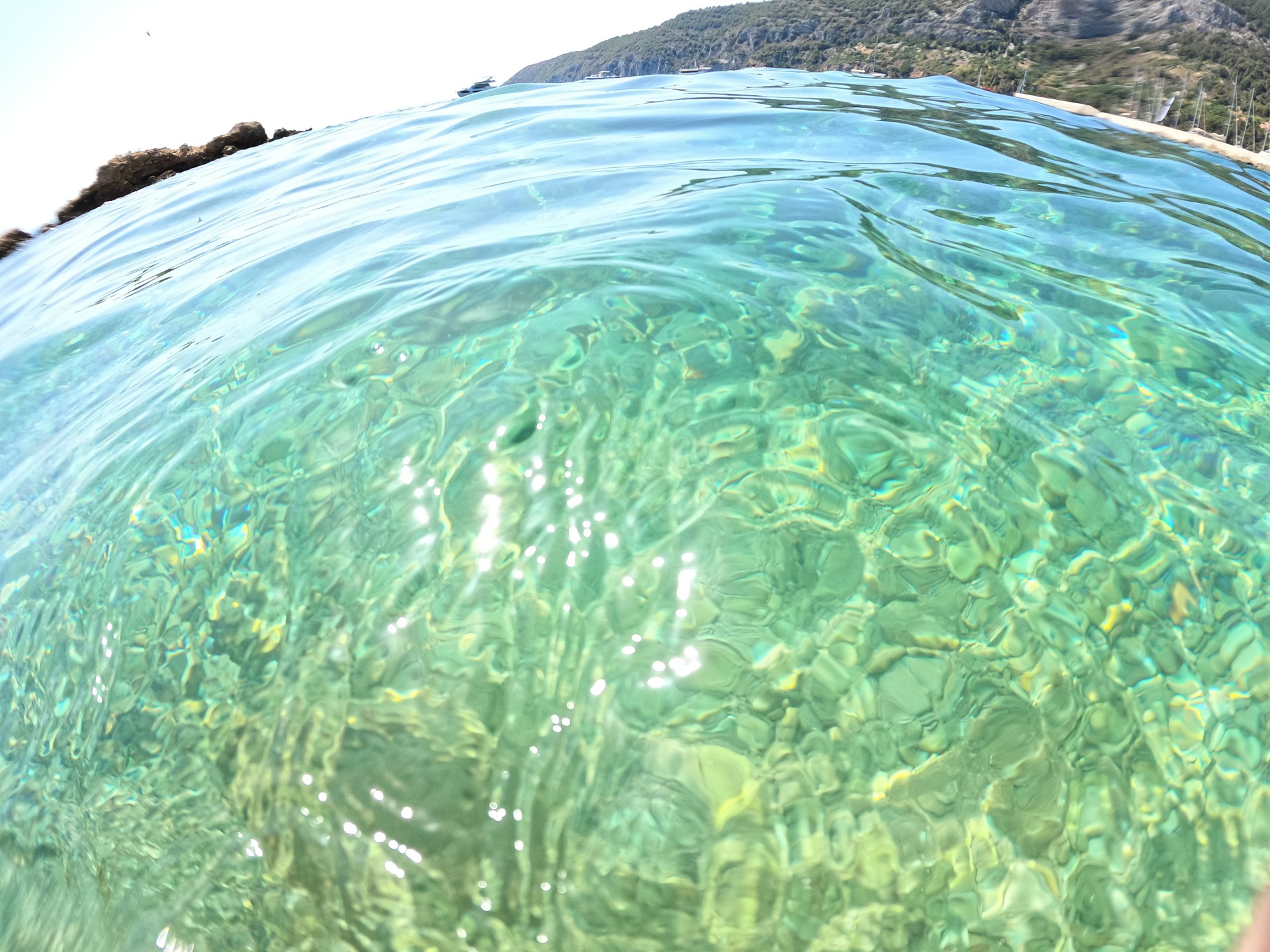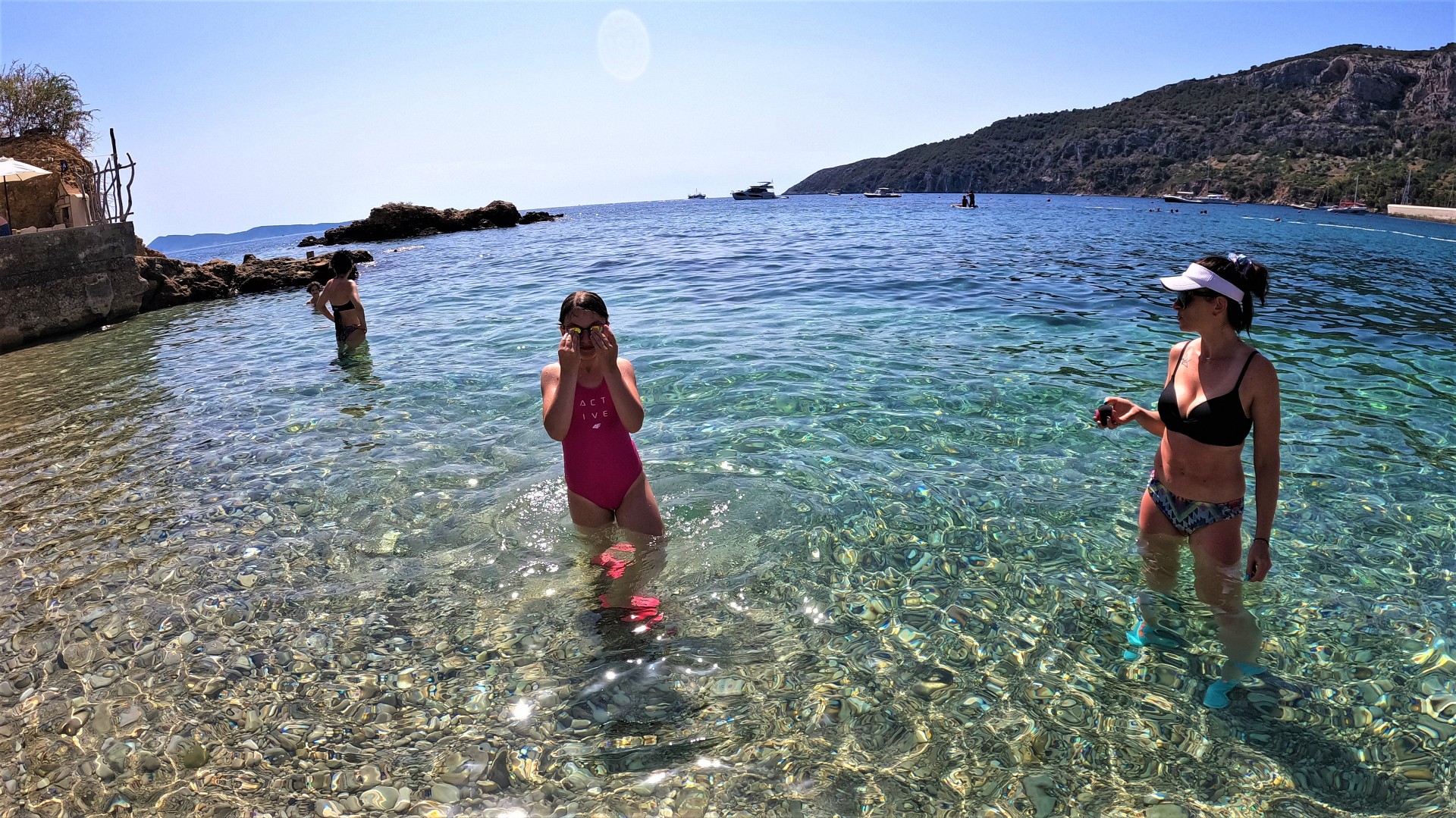 Dzieci bawiły się w wodzie, zbierały kolorowe kamyczki, bo plaża kamienista. Bez butów do wody bardzo niewygodnie. Bardzo przyjemna woda, ładna plaża. Ludzi w sam raz- nie było ich za wiele i dobrze, bo nie było tłoku. Mimo dobrego kremu do opalenia, jak się okazało nazajutrz, spaliliśmy się tego dnia dość srogo.