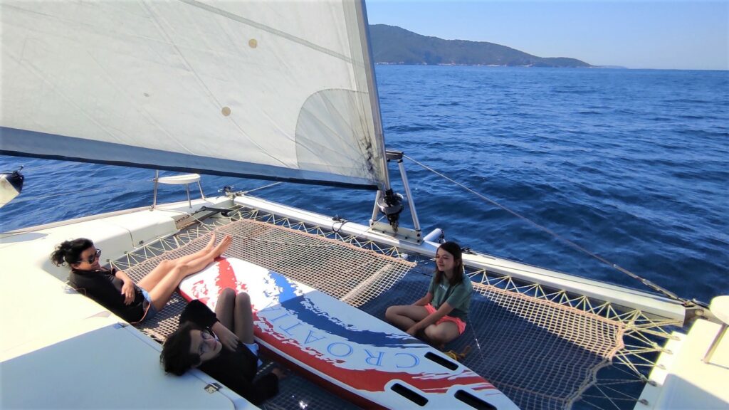 A swoją drogą, to widzieliśmy dzisiaj w Komižy przy marinie ogromny 60- stopowy katamaran, który ma nawet własną obsługę. To dopiero luksus! Imponująca wielkość, przestrzeń widoczna z zewnątrz a i z opowieści Mariusza wiemy, co tam na pokładzie się znajduje, bo on pływał dokładnie takim modelem katamarana po Karaibach.
