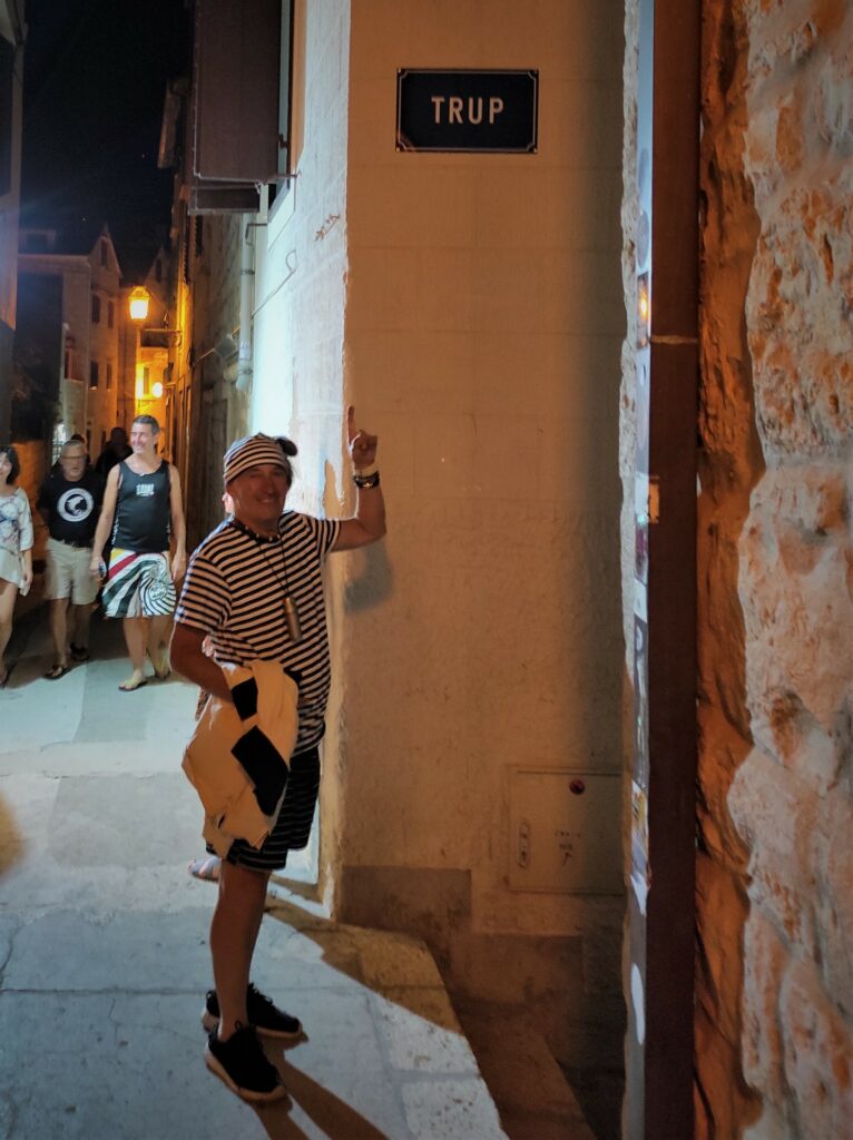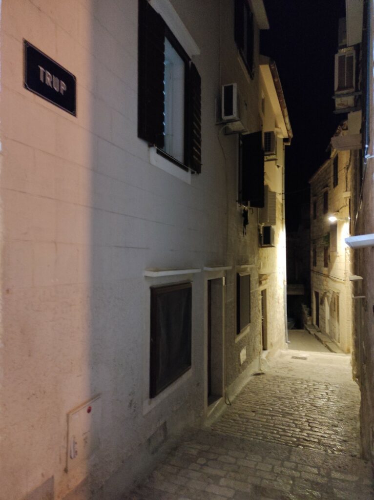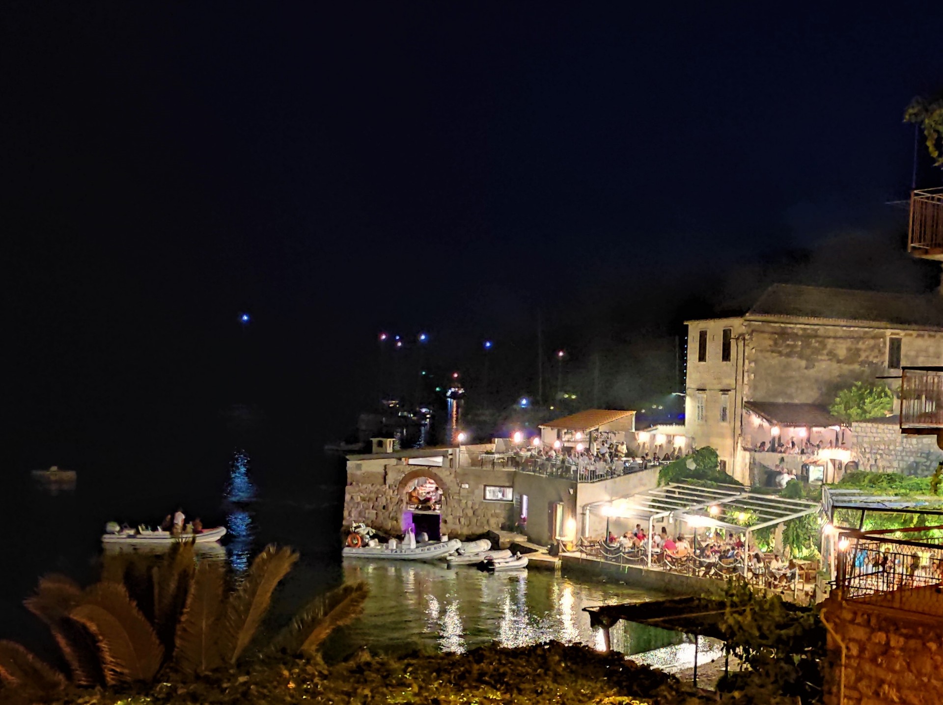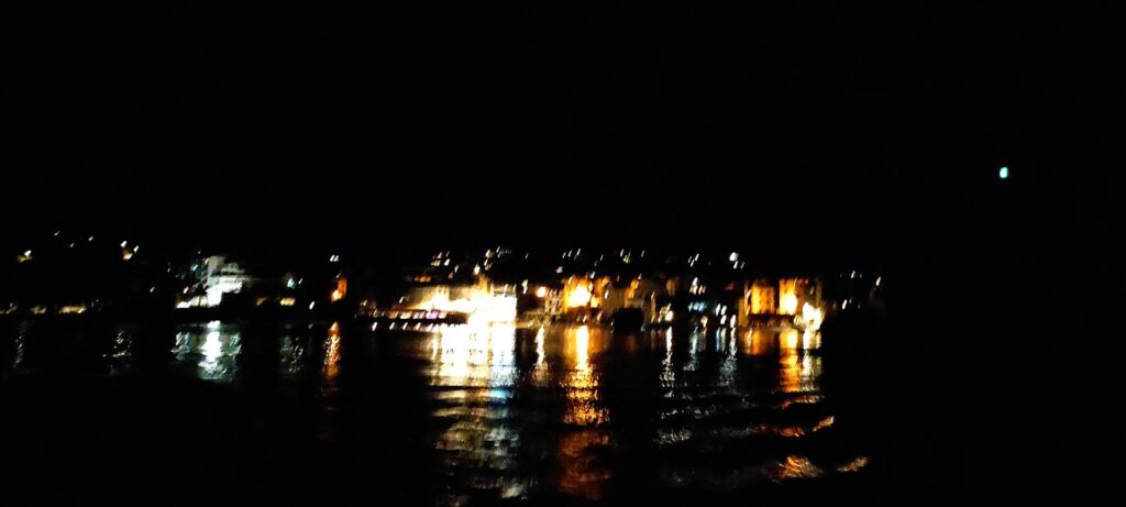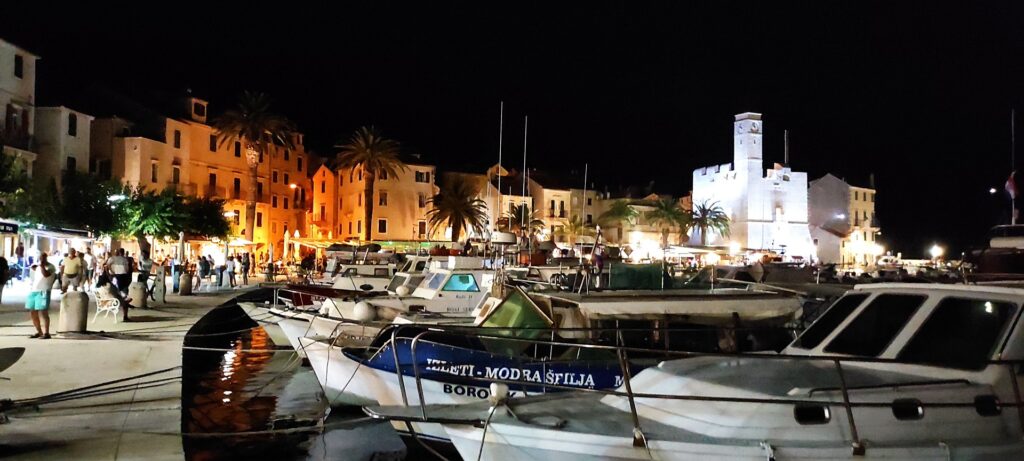 Najedzona pierwsza grupa popłynęła z Mariuszem na jacht, a my spacerkiem pooglądaliśmy tą urokliwą wioskę rybacką nocą. Bo w nocy tętni to miejsce życiem! Niektórzy, wystrojeni, ze swoich drogich jachtów idą do nabrzeżnej restauracji na kolację i drinki. Inni spacerują podziwiając grę świateł na budynkach, marinie i jachtach przycumowanych do jedynego peera (pomostu) na marinie.