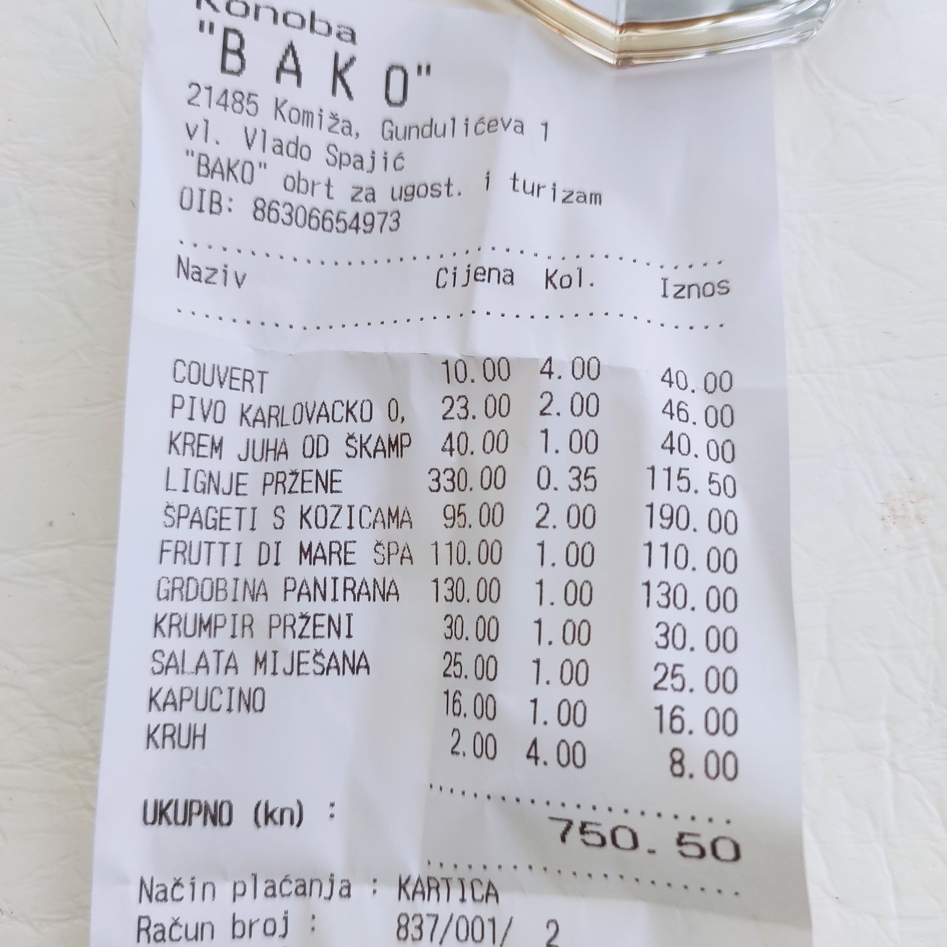 Za jedzenie dla naszej trójki, Ryszarda i naszego Skippera Mariusza zapłaciliśmy w sumie 750,50 kun, czyli 458,60 zł.