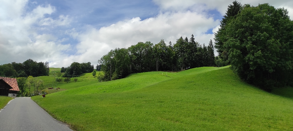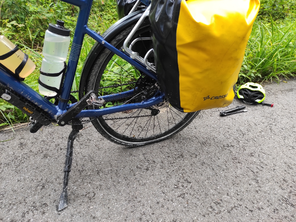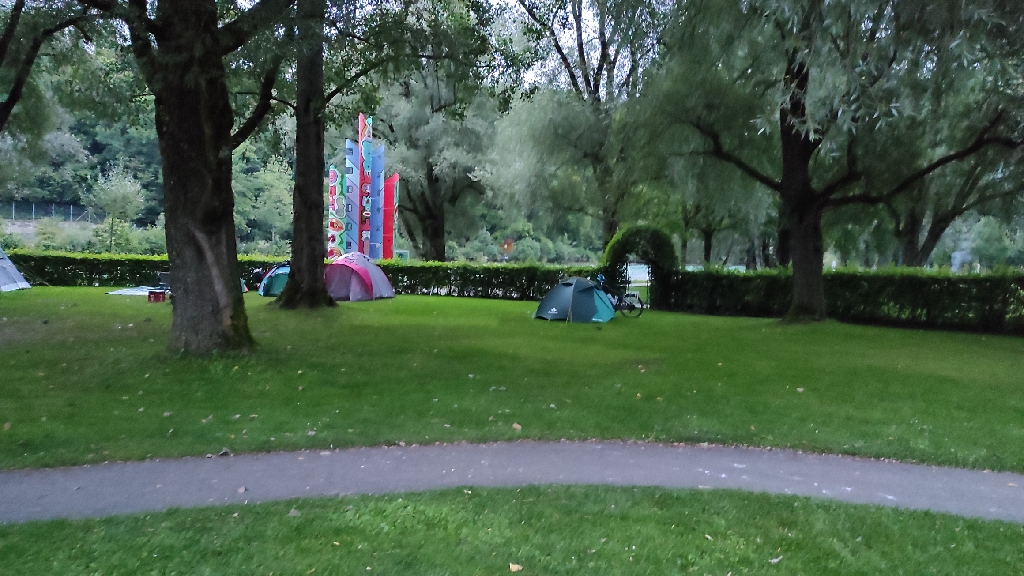 Plan miałem, by dojechać do jezior za Bern, jakieś 30 km. Niestety najpierw z rana deszcz, który musiałem przeczekać i pakowałem mokry namiot. Później zalane wodą nieprzejezdne ścieżki rowerowe, więc musiałem zawracać i szukać objazdów, to jeszcze więcej czasu w plecy i niepotrzebnych kilometrów. To znowu złapałem kapcia tym razem z tyłu. Doszedłem już do takiej wprawy, że wydarcie dętki z namierzeniem dziury, jej załataniem i założeniem oraz napompowaniem zajęło mi już tylko 25 min. Zostałem bez dodatkowej dętki na wymianę, poprzedniej dziury nie udało mi się znaleźć. Przejeżdżał starszy gość, zaoferował pomoc. Spytałem po niemiecku, gdzie jest najbliższych sklep rowerowy? Okazało się że naprawdę blisko, bo jakieś 400 m dalej zaraz za ścieżką rowerową. Kupiłem dwie dętki i dodatkowe łatki, bo widząc że codziennie coś się dzieje, nastawiłem się na wiele dziur w gumach. Na miejscu dopompowałem kompresorem koła, bo moją ręczną pompką, to się można dojechać.