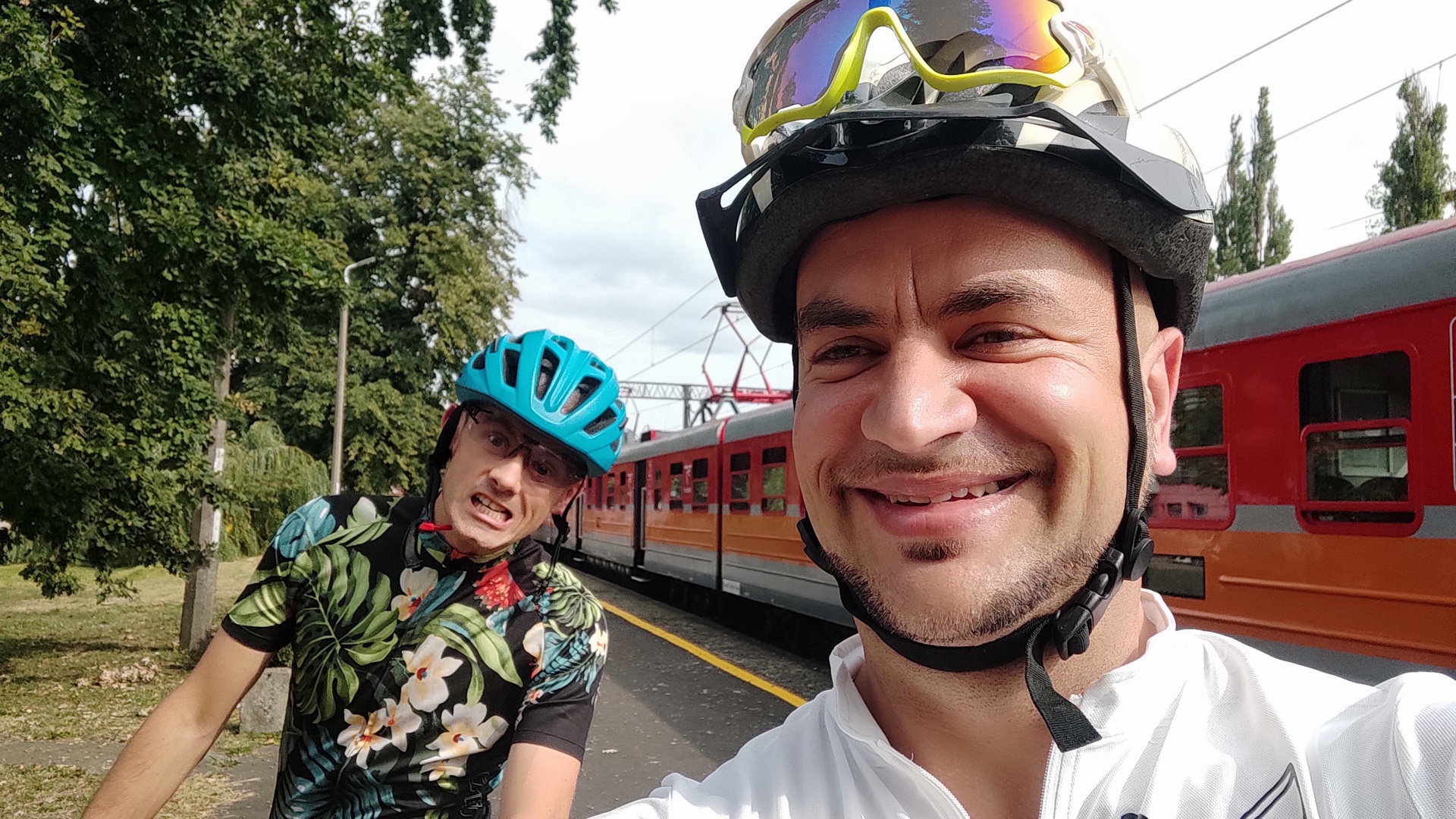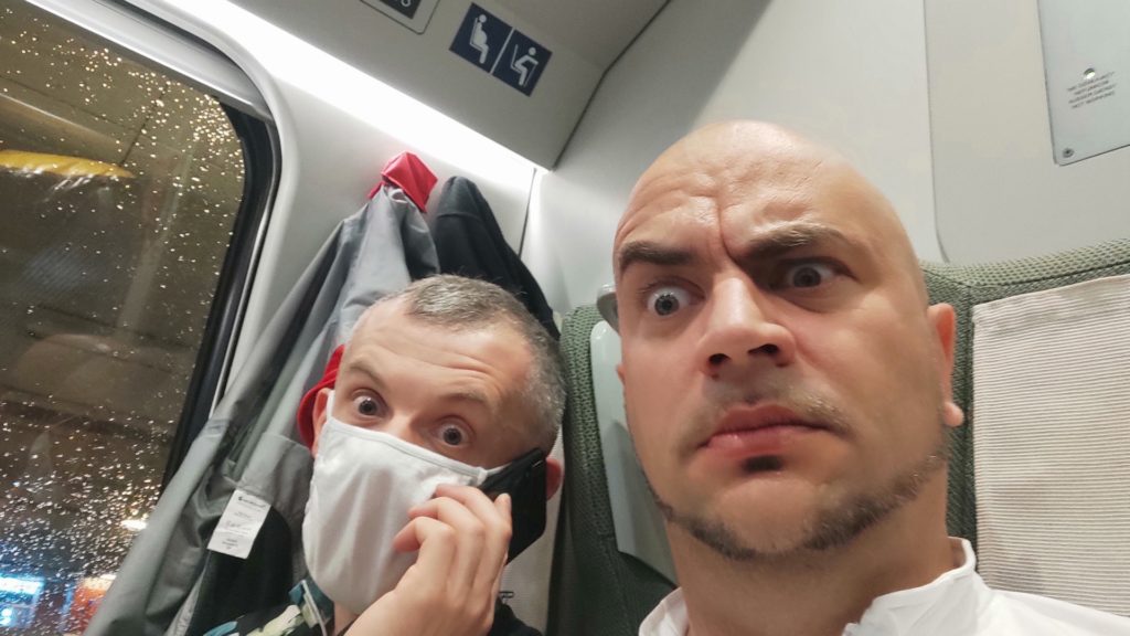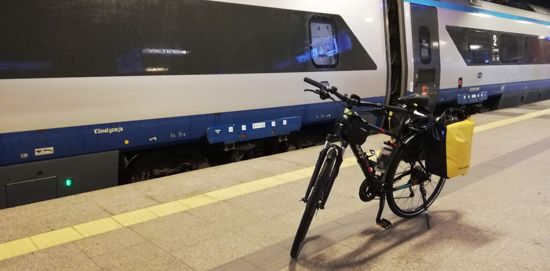 Pojawił się w końcu zmoknięty Opcio. Zlał go deszcz, gdy jechał z domu na dworzec. Zapakowaliśmy się do właściwego 6 wagonu Pendolino. Niestety, uchwyty rowerowe w tym pociągu to naprawdę nieporozumienie. Rowery się w przejściu między toaletą a przedziałem pasażerskim za przednie koło. Oba nasze rowery po założeniu na owe haki tak blokowały przejście że wszyscy wsiadający, wysiadający i przechodzący między wagonami klęli nie tylko pod nosami. Rowery bujały się w czasie jazdy, więc dodatkowo ludzie łapali za co popadło, a to za uchwyt do kamerki, a to za uchwyt do smartfona. Jakby nie mogli za rączkę na kierownicy. Wszystko w efekcie mieliśmy poprzestawiane. Na szczęście nie połamane.