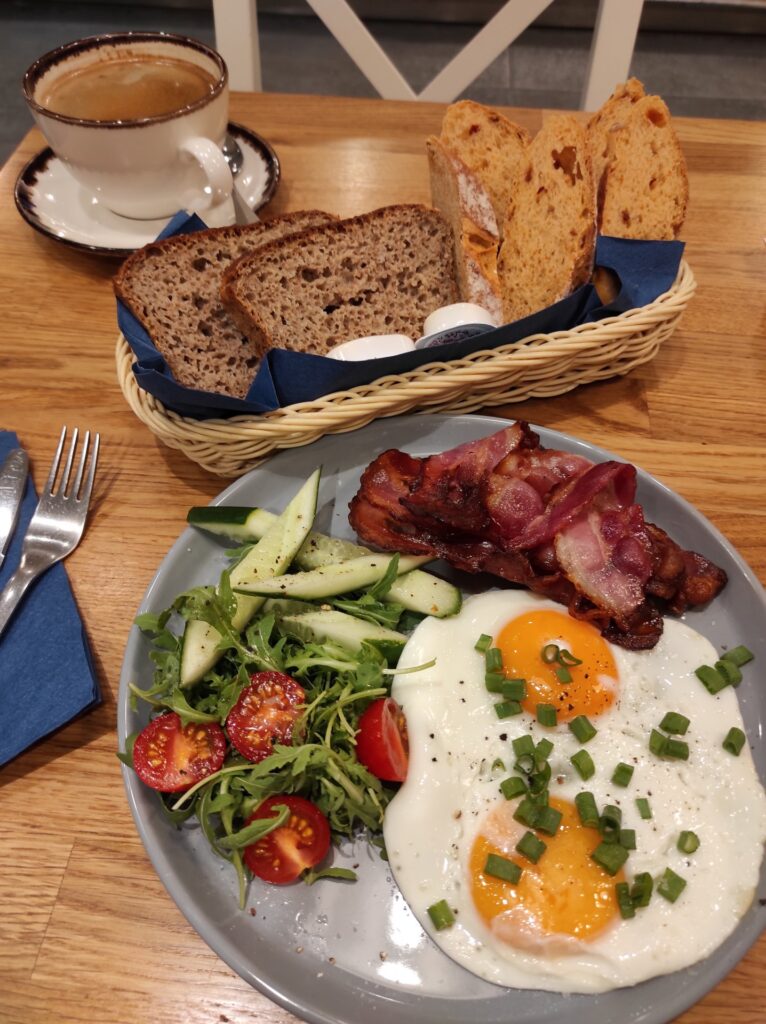 10 min później już na dworcu zdecydowałem się, że śniadanie dzisiaj będzie francuskie we francuskiej kawiarence na dworcu. La Bagette się nazywa. Bardzo smaczna duża kawa, jajka sadzone z bekonem, przepyszne pieczywo wypiekane na miejscu (bo to jest też piekarnia), trochę pomidorów i ogórków oraz roszponka. Myślałem, że się nie najem, a jednak było akurat tak, jak potrzebowałem na rozruch. Kupiłem jeszcze kanapkę i drożdżówkę oraz picie na podróż. Stanąłem na peronie o 9:30. O 9:59 miał być mój pociąg.