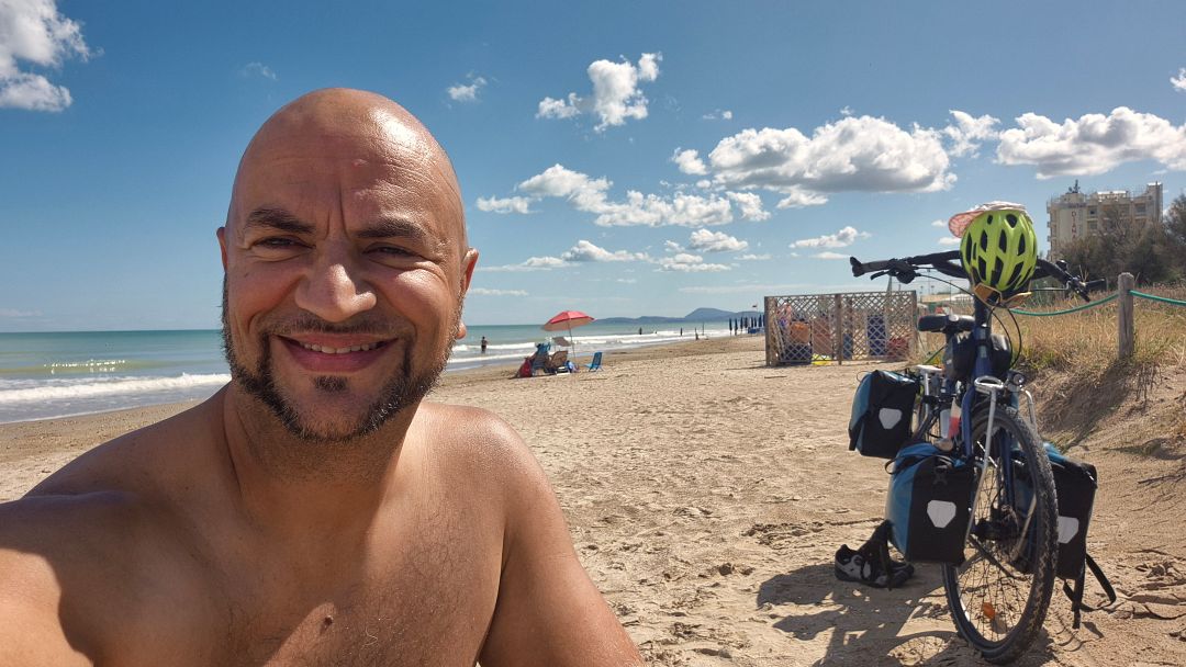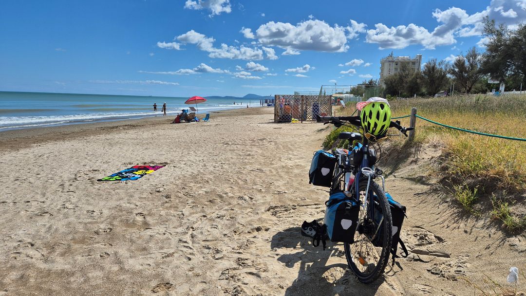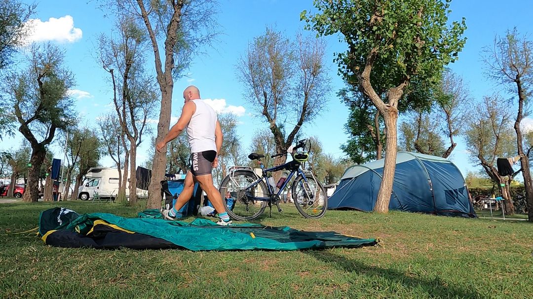 Przed 18 dojechałem do Camping Bellamare. Co ciekawe, byłem przed Fabianem, bo jak się okazało – on pojechał dłuższym i bardziej wymagającym wariantem trasy. Zanim zacząłem rozbijać namiot, Fabian do mnie dołączył i rozbiliśmy się obok siebie. Mieliśmy dla siebie ogromną parcelę z dostępem do prądu. Były niewysokie drzewka dające troszkę cienia. Ale ogólnie camping sprawił na mnie bardzo miłe wrażenie. Sanitariaty spore, czyste i były blisko. Był sklepik, ale w środku się okazało, że jest gorąco jak w ulu, a lodówki powyłączane, więc picie było ciepłe. Zaś restauracja obok miała się otworzyć później. Dlatego poszedłem się wykąpać w morzu. Później poszedłem do restauracji zjeść kolację i napić się radlerka. W ramach obiadu, którego dzisiaj nie zjadłem na trasie, zamówiłem makaron tagliatelle z sosem bolońskim, a w ramach kolacji wziąłem jeszcze pizzę, bo widziałem na sąsiednich stolikach, że wygląda smakowicie. A do pizzy aperol. Ale to wszystko było dobre! Wykąpany i umyty, poszedłem spać.