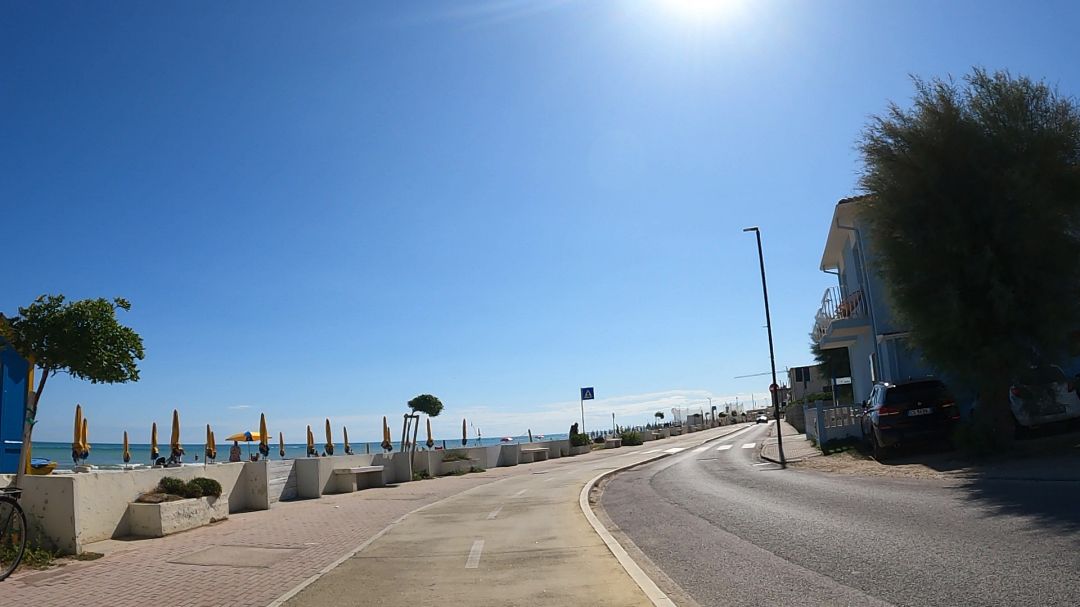Dzisiaj była piękna pogoda. Było jeszcze trochę chmurek, ale słońce z każdą godziną grzało coraz mocniej. Cały dzisiejszy dzień jechałem wzdłuż wschodniego wybrzeża Italii. Bardzo wakacyjnego wybrzeża. Droga rowerowa ciągnęła się przez cały czas w podobny sposób. Dwupasmowa ścieżka rowerowa, oddzielona od ciągu pieszego i od jezdni. Często ścieżka rowerowa była pomalowana na niebiesko i mam podejrzenie, że wynika to z jakiejś regulacji w regionie Marche. Nie dało się w jakiś spektakularny sposób zauważyć zmiany w tym względzie podczas zmiany regionu na Abruzzo gdy dzisiaj to zrobiłem, ale jakby po fakcie w końcu zwróciłem uwagę na to, że ścieżka już niebieska nie była. Abruzzo, to już szósty region przez który przejeżdżam w tym roku we Włoszech. Pierwszy, to był Trentino – Dolina Adygi, później przejechałem skrajem Veneto, Lombardię w rejonie Mantua. Ferrara była pierwszym większym miastem kolejnego regionu Włoch, czyli Emilia-Romagna. Między Rimini a Pesaro przekroczyłem kolejną granicę regionów i wjechałem do Marche a dzisiaj Abruzzo.