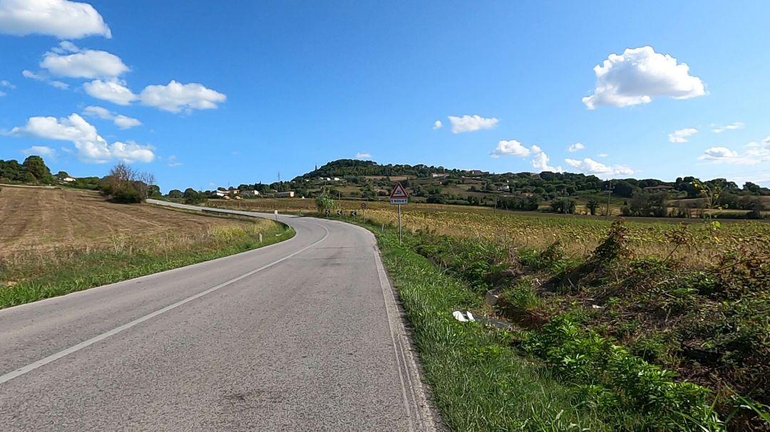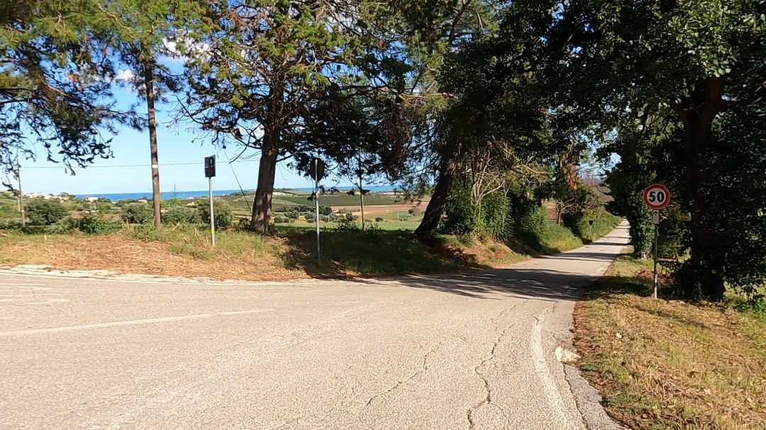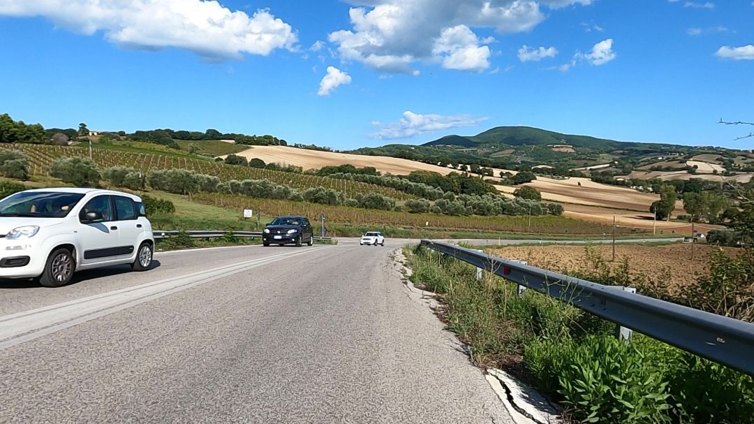 Gdy już udało mi się wyjechać z centrum miasta i zacząłem jechać nieco bardziej wgłąb lądu, czyli na południe a nie wzdłuż wybrzeża, rozpoczął się podjazd. Ostry. Do tego jeszcze nawigacja prowadziła mnie w niezrozumiały sposób jakimiś estakadami, więc po dwóch pomyłkach w końcu udało mi się znów wbić na szlak. Zacząłem mijać sypialnie Ancony, ale sapałem i pociłem się niemiłosiernie, bo podjazd okazał się być spory. Gdy wreszcie dojechałem na szczyt, sprawdziłem w nawigacji, ile jeszcze podjazdów przede mną i okazało się, że jeszcze 4, z czego najwyższy dopiero przede mną! No ale chociaż mogłem się przez chwilę cieszyć dość długim i szybkim zjazdem. No jednak nie lubię podjazdów na koniec dnia! Jeśli ktokolwiek z Was właśnie ma ochotę spytać mnie, czy nie dało się pojechać inaczej, żeby nie wspinać się tyle? Odpowiem – niestety nie. Jazda wzdłuż wybrzeża wiązała się z jeszcze większą ilością podjazdów i przewyższeń, bo Ancona jest usytuowana na wzgórzach, które dość ostro wpadają do morza. Wytyczając trasę więc, wybrałem właśnie tę, którą właśnie zaczynałem znów się wspinać i miałem świadomość, że to była najlżejsza wersja trasy. Inne były tylko gorsze. Trzeba było więc zacisnąć zęby i cisnąć nogami. Oj ciągnął się ten podjazd! Sceneria była urokliwa, bo falujące wzgórza pięknie namalowane – jak z obrazka. Ale cały czas pod górę. 10-16% nachylenia. Masakra. Gdy dojechałem do tablicy z nazwą miejscowości „Camerano”, zatrzymałem się, by nagrać film na relację na social mediach. Powiedziałem w filmie, że Camerano, to ból, bo teraz po tym roller-coasterze i ostrym podjeździe, Camerano będzie mi się kojarzyło z bólem! Cały spocony i zdyszany dojechałem jednak w końcu na szczyt najwyższego dzisiejszego podjazdu. Ale po zjeździe czekały na mnie kolejne jeszcze dwa podjazdy.
