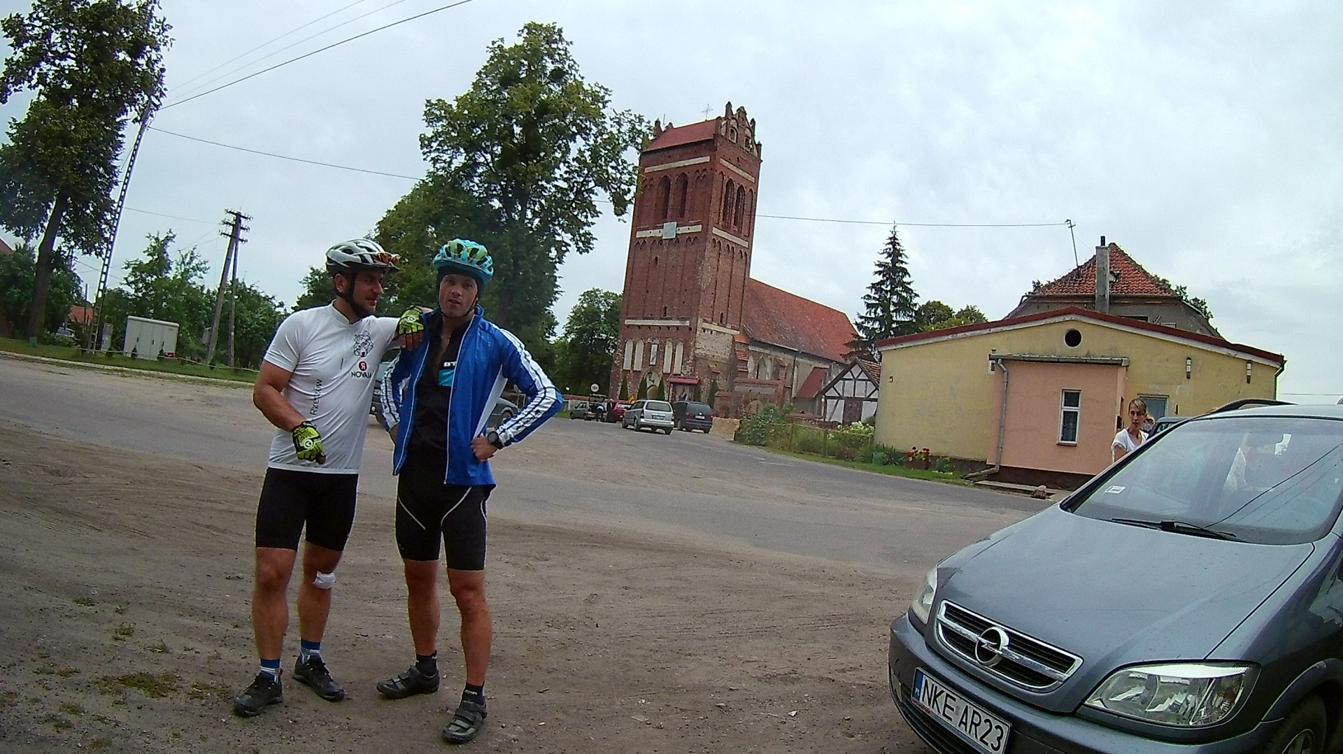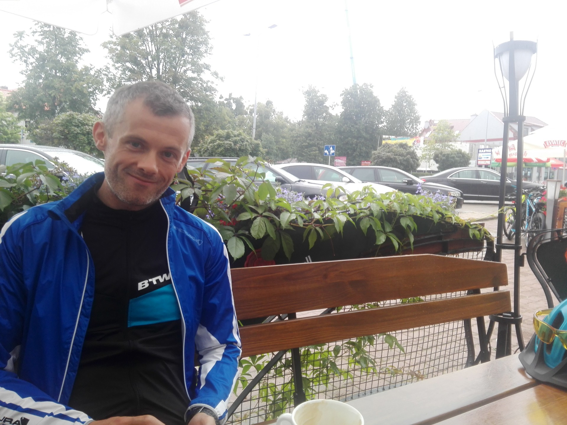 Obiad wypadł nam w Węgorzewie w Karczmie. Smacznie i niedrogo. Przemiła młoda dziewczyna z obsługi. Na miejscu okazało się że obiad już je ekipa LeKurdePologne z Decathlona, czyli goście z firmy Opcia. Spaleni słońcem. Łysi. Młodzi i zadowoleni. My- starzy, zmarznięci, nieopaleni i łysiejący (o pardon Opcio! Łysiejący, to tylko ja) i wkurzeni że znowu leje i będzie lać. Szkoda tylko, że nie zaproponowali nam nawet byśmy się dosiedli poopowiadali, wymienili spostrzeżeniami i doświadczeniami z trasy. Słabo Panowie! Na szczęście zwolnił się stolik z widokiem na nasze rowery, więc mi przeszło.