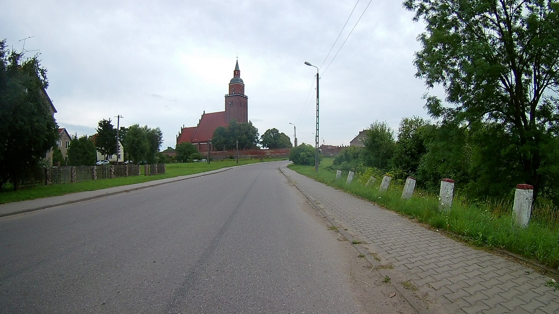 Asfalt słabej jakości, ale i tak szybciej można się po tym poruszać niż po szutrze (zwłaszcza pofałdowanym i zmoczonym, w którym mocno obciążone sakwami tylne koło się zapada). Takimi bocznymi drogami gminnymi dojechaliśmy do Sątoczna.