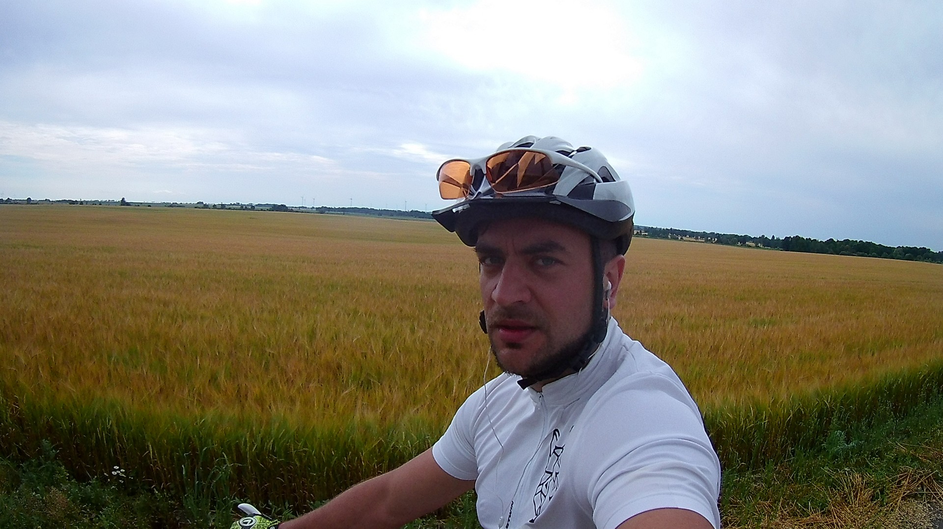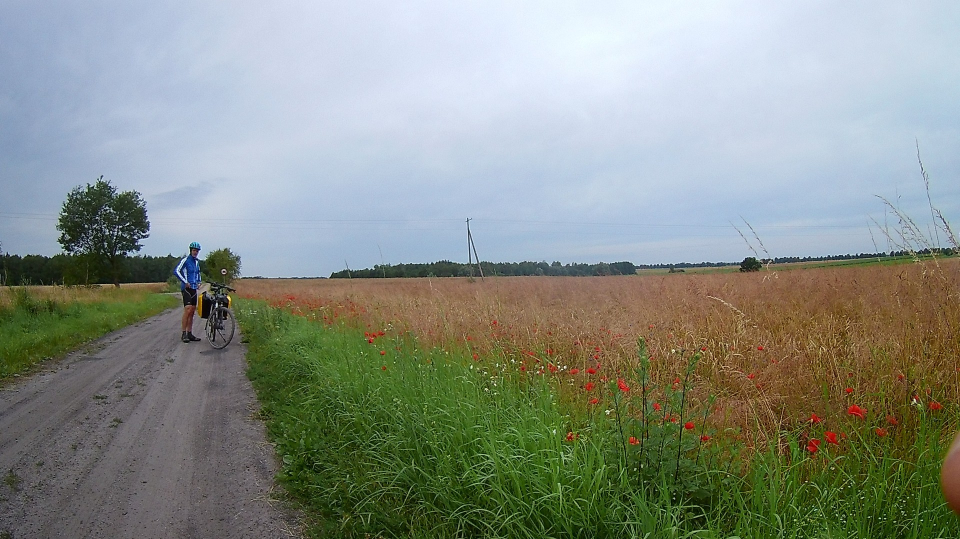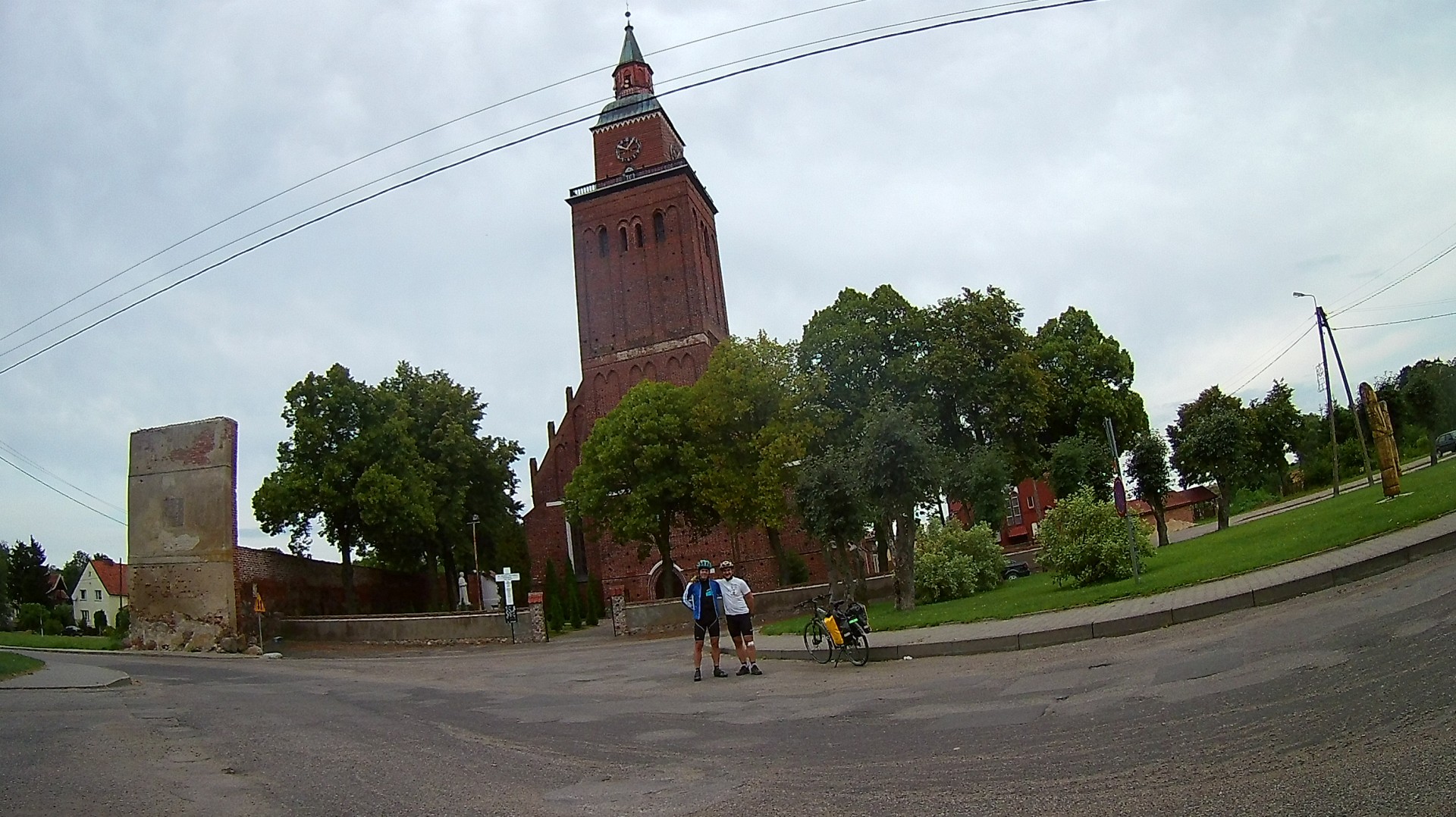 Ponieważ wczoraj poszliśmy spać po 1 w nocy, bo wizyta na SOR w Bartoszycach ciągnęła się niemiłosiernie, dzisiaj ciężko było się zwlec. A jednak po 8 już byliśmy na dwóch kółkach. Prognozy pogody były kiepskie – prawdopodobnie koło 12 zacznie padać i będzie lało że hej! Wariant optymistyczny- dojedziemy do Gołdapi. Pesymistyczny- do Węgorzewa. Na szczęście trasa leciała całkiem przyjemnie. Słońce wychodziło zza chmur i znikało, ale przynajmniej poza mżawką przelatującą co chwilę było względnie sucho. Non stop widzieliśmy coraz bardziej zbliżające się ciężkie ołowiane deszczowe chmury za nami, dlatego staraliśmy się jak najdalej od tego uciec. Droga z Bartoszyc początkowo leciała względnie dobrym asfaltem, sporo szutru przez pola i lasy. To w górę, to w dół, więc płaskich odcinków nie było za wiele. W Sępopolu zatrzymaliśmy się na chwilę, by zrobić zdjęcia i przetestowałem pilota ze zdalną migawką aparatu w mojej Action Camera.