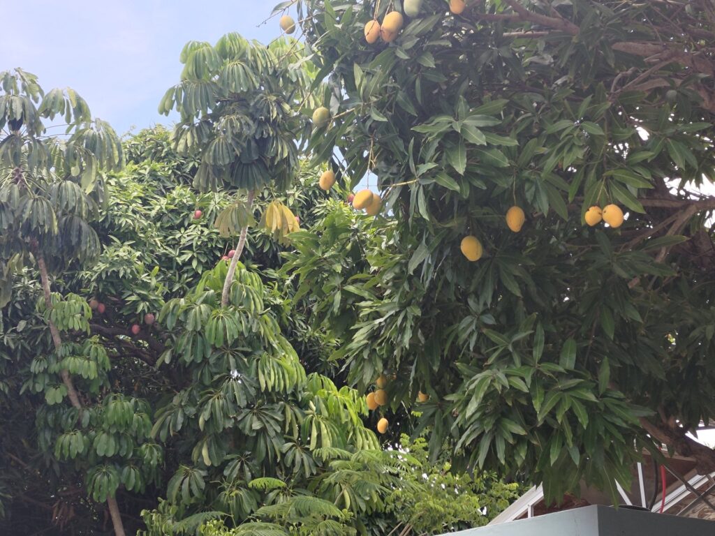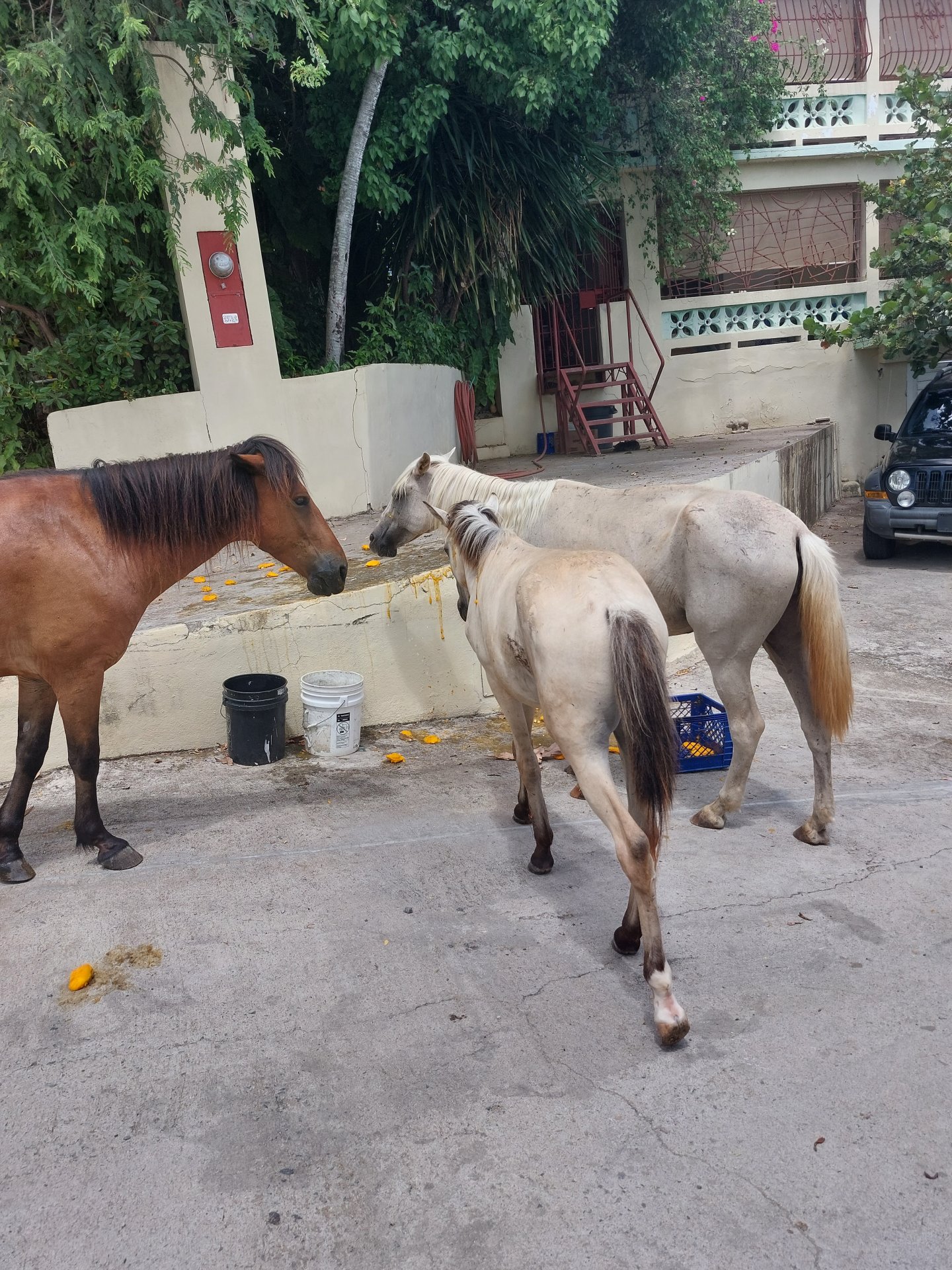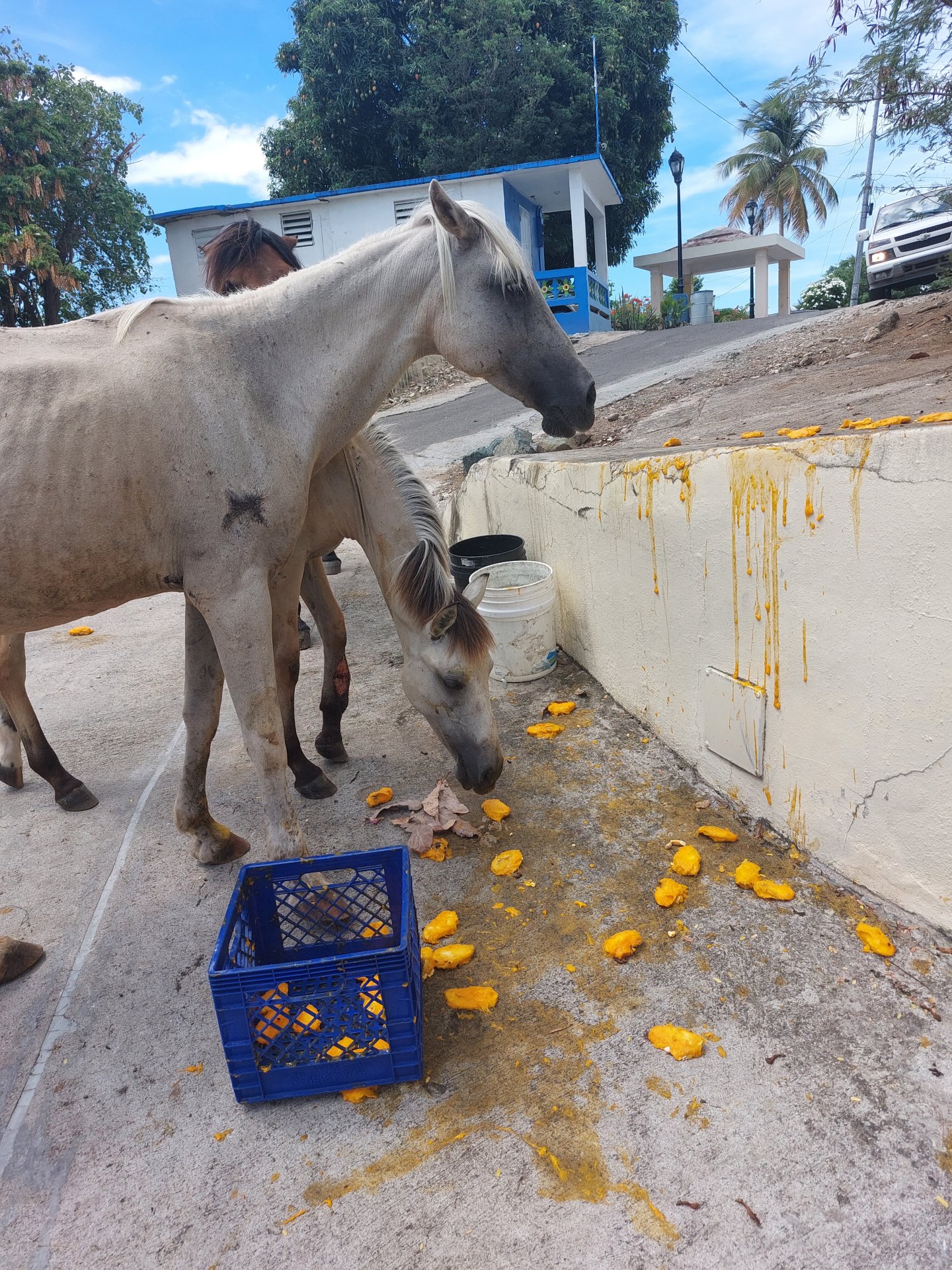Usiedliśmy z Grażyną w Mama Mia jakieś 20 minut od Rancho i oprócz imnych napoi wzięliśmy Mozzarella Sticks – które się okazały być jednymi z najsmaczniejszych, jakie kiedykolwiek jadłem! Gdy dziewczyny wróciły z koni, mieliśmy jeszcze trochę czasu, bo wypożyczenie auta było umówione na 14. Poszliśmy więc na plażę obok portu. Po drodze spotkaliśmy dzikie konie, które jadły mango i piły wodę. Jeden z właścicieli domów miał drzewo mango, z którego spadały owoce i pewnie on sam nie był w stanie ich wszystkich zjeść, więc pozbierał te spadłe owoce do wiaderka, do drugiego nalał wody i dał to koniom. Te przeciskając zębami owoce do asfaltu wyjadały słodką soczystą zawartość i zostawiały tylko „włochatą” pestkę na ziemi.