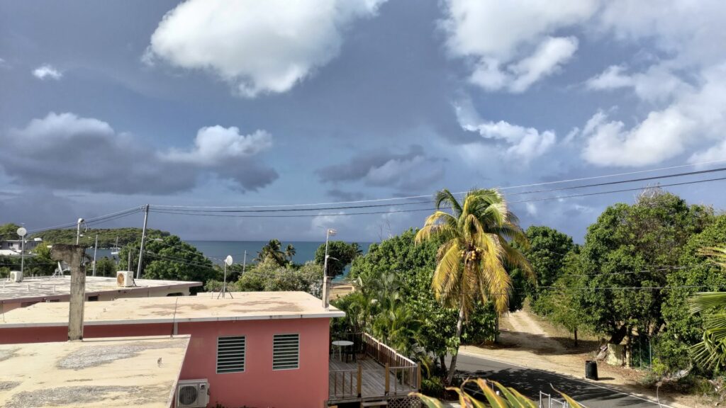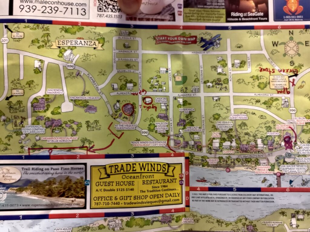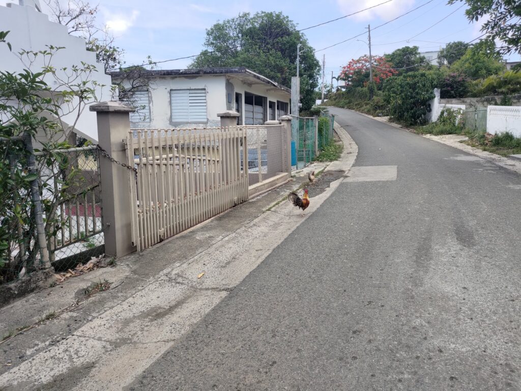 Pierwsze wrażenia z Vieques były takie, że było tu skromniej niż na dużej wyspie. Domy, obejścia, samochody – wszystko było biedniejsze. Sporo było też pustostanów, zamkniętych lokali, restauracji. Niektóre samochody widać, że stoją nieużywane od ponad roku – czasami z uchylonymi szybami. Ale podobnie jak na dużej wyspie – wszędzie chodzą sobie wolno kury i koguty piejące o każdej porze – nie tylko z rana. Wszyscy mówią po hiszpańsku ale już nie wszyscy mówią po angielsku. Zwłaszcza starsi mają problem z angielskim. Młodzi, praktycznie wszyscy lepiej lub gorzej, ale mówią po angielsku. Tutaj na wyspie widać jest pewne różnice w stosunku do dużej wyspy – jeśli chodzi o infrastrukturę. O wiele więcej jest anten do dostępu do Internetu – głównie rozwiązania Ubiquity i co widać po antenach, są to anteny mające co najwyżej kilka lat (pewnie po tym czasie je operatorzy wymieniają). Kable i słupy na których są one podwieszone są w o wiele gorszym stanie niż na dużej wyspie. Paneli fotowoltaicznych też jest mniej. Ponoć w dużej mierze to wynik katastrofalnych zniszczeń po dwóch huraganach – Maria, która uderzyła w 2018 roku i Fiona z 2022 roku. Towarzystwa ubezpieczeniowe ponoć nie wypłaciły środków wszystkim i podobno sporo ludzi nie dostało do dziś pieniędzy obecanych przez rząd na naprawę skutków tych kataklizmów. To zblokowało tym osobom możliwość odbudowania swoich domów, biznesów. Nie miałem jednak okazji spotkać takiej osoby, by mi o tym opowiedziała, więc pewności 100% nie mam.