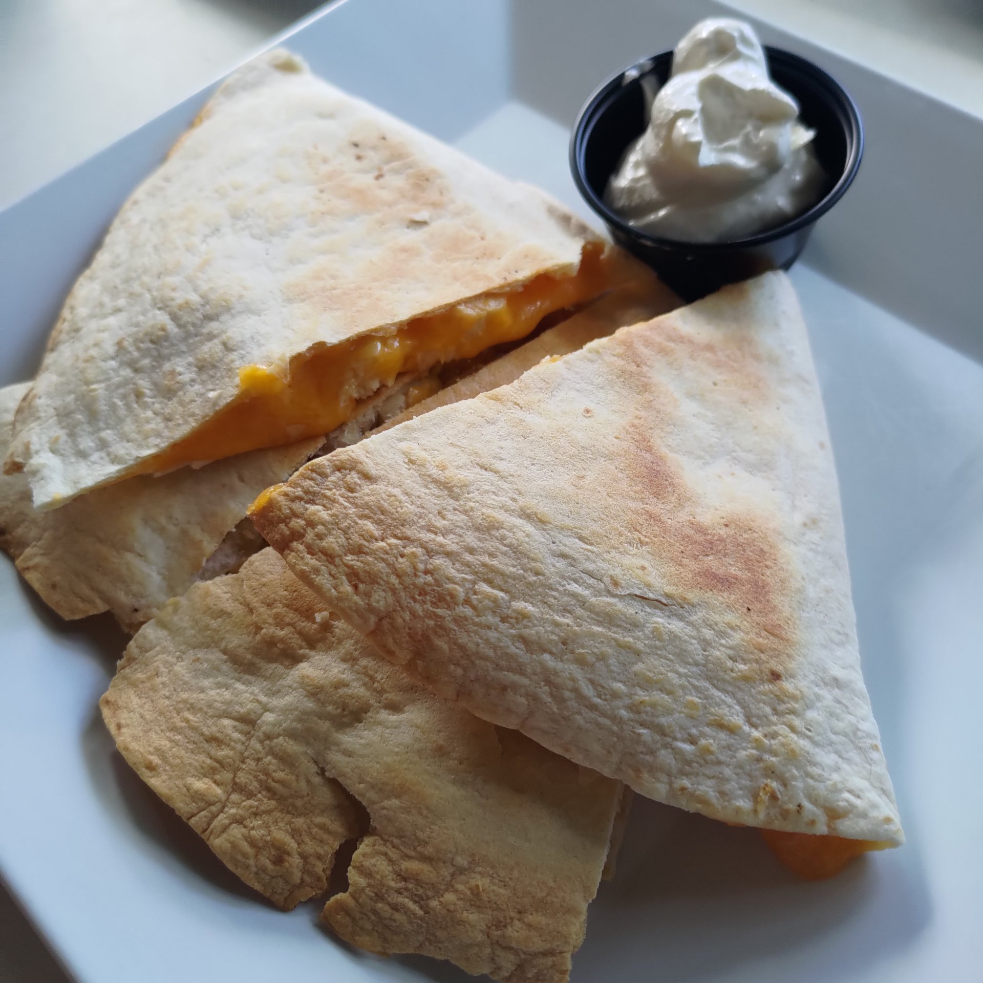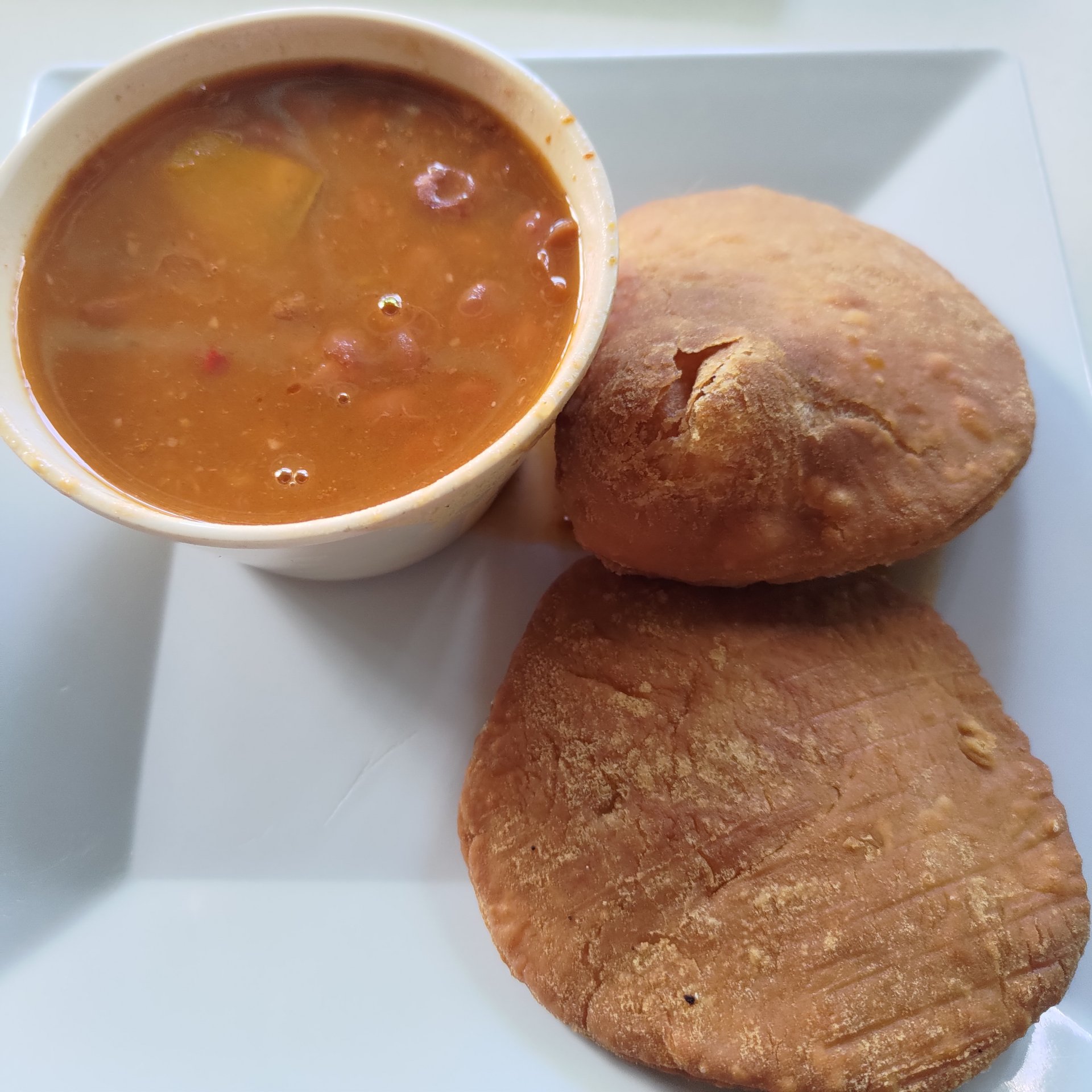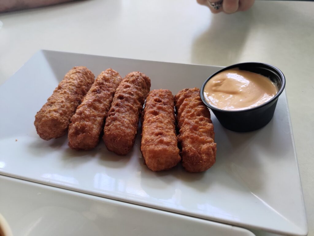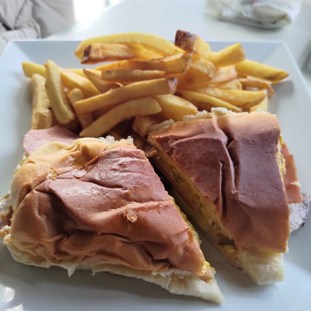 Ponieważ zgłodnieliśmy, to czekając na umówioną godzinę gdy mieliśmy pożyczyć auto i ruszyć dalej, usiedliśmy w knajpce obok portu. „El Yate” się kanjpka nazywała. Zamówiliśmy co kto chciał. Ja wziąłem Arepę, która kojarzy mi się bardziej z Wenezuelą w której Bartek z „Bez Planu” właśnie tym przysmakiem się zajadał. Było to całkiem smaczne.