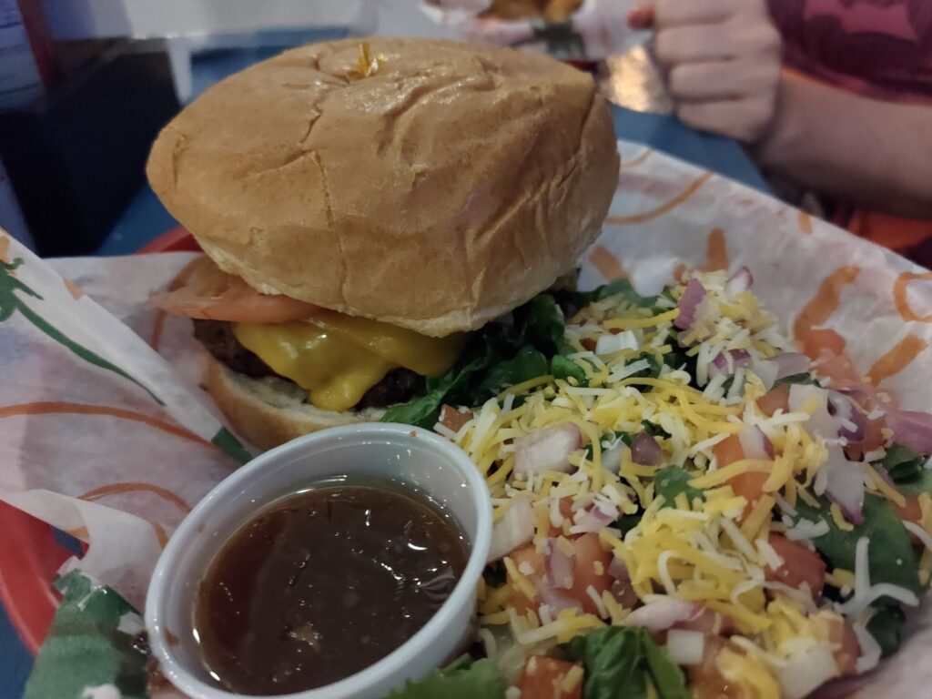 Gdy wróciliśmy z naszym szalonym kierowcą – gadułą po przebraniu się w suche rzeczy, poszliśmy jeszcze na kolację i drinki do baru „Lazy Jack’s”. Zjedliśmy tam kolację – ja oczywiście burgera (który był niezły, ale bez szału) i popiliśmy drinkami z lokalnym rumem.