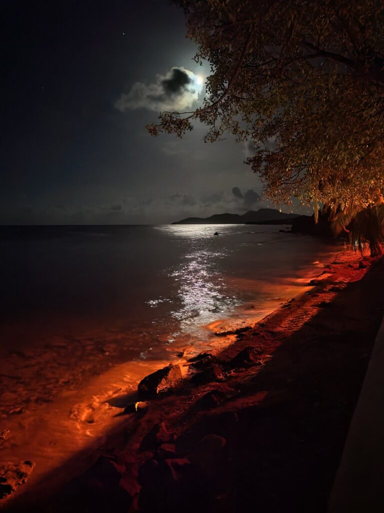 Było ciemno. Nasze dwie przewodniczki miały czołówki, ale tylko jedna z nich używała czerwonego słabego światła i to ona płynęła na supie na przedzie. Druga z nich była do pomocy i asekuracji, więc większość czasu pływała na swoim supie na tyle, albo gdzieś w pobliżu naszej chyba 10-osobowej grupy. Płynęliśmy nieśpiesznie na środek tej zatoki otoczonej z trzech stron. O co chodzi z tym całym „bio Bay”? Ano o to, że płyniesz kajakiem, a woda pod tobą jarzy się fluorescencyjnym seledynowym blaskiem. Na stronie internetowej i ulotkach wyglądało to spektakularnie. Nie dziwiło nas zatem że do oglądania świecącej się wody, kajak powinien mieć przeszklone albo chociaż przezroczyste dno. Nasze kajaki miały. Niestety, światło księżyca było silne i jakoś tak ten cały efekt jarAcej się wody pod wpływem wprawiania jej w ruch wiosłem czy ręką nie był na żywo aż tak spektakularny. Najgorsze jest to, że przewodniczka mówiła bardzo bardzo szybko po angielsku i w połączeniu z odległością i zmrokiem w którym nie.moglem wodzie jej ust, mój uszkodzony słuch spowodował, że nie zrozumiałem zbyt wiele z tej wycieczki. Później dziewczyny streściły mi to. No więc, co powoduje że w pewnych określonych warunkach, w określonych miejscach pod wpływem wprawiania wody w ruch, ta zaczyna się świecić w nocy? Żyjątka morskie, które wciąż nie zostały w dobrym stopniu zbadane. To plankton, który żyje bardzo krótko (przez co trudno go dokładniej zbadać). To właśnie ten plankton w określonych warunkach wskutek stresu wywołanego nagłą zmianą pozycji w wodzie, zaczyna jarzyć się fluororescencyjnym światłem. Tak więc przy ruchu wiosłem, albo gdy zanurzymy rękę i nią w wodzie machamy, woda zaczyna nam świecić.