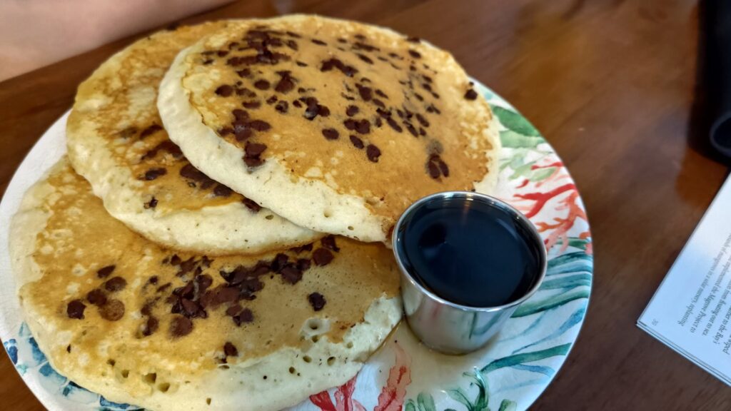 Gdy obudziliśmy się rano i wyjrzałem przez okno, ciemne chmury groziły nam, że znów może padać. Mieliśmy jednak plan na dzisiejszy dzień, więc spakowaliśmy się, poszliśmy na dół naszego hostelu zamówić śniadanie. Powiem Wam, że śniadania tutaj, to coś pysznego! Ja wziąłem pancakes z borówkami, Jagoda wzięła pancakes z czekoladowymi płatkami i syropem klonowym, a Grażyna jajecznicę z szynką i racuchami. Jakie to było dobre!