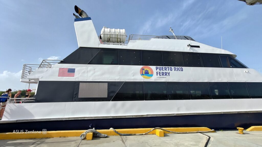 Wyjazd na Vieques był trochę inny, bo to nie był wypad jednodniowy, a na dwa dni, więc oprócz plecaków, wzięliśmy jeszcze dwie małe walizki. Podobnie jak poprzednio, z naszego domku w Luquillo na wschodnim wybrzeżu pojechaliśmy naszą szarą strzałą do Ceibe, tam wysadziłem dziewczyny w porcie a sam podjechałem na parking. Opłata za 2 dni, to 30$. Bus dowiózł mnie do portu i po jakiejś pół godzinie wsiedliśmy na pokład dużego promu. Do Vieques płynie się szybciej niż na mniejszą Culebrę.