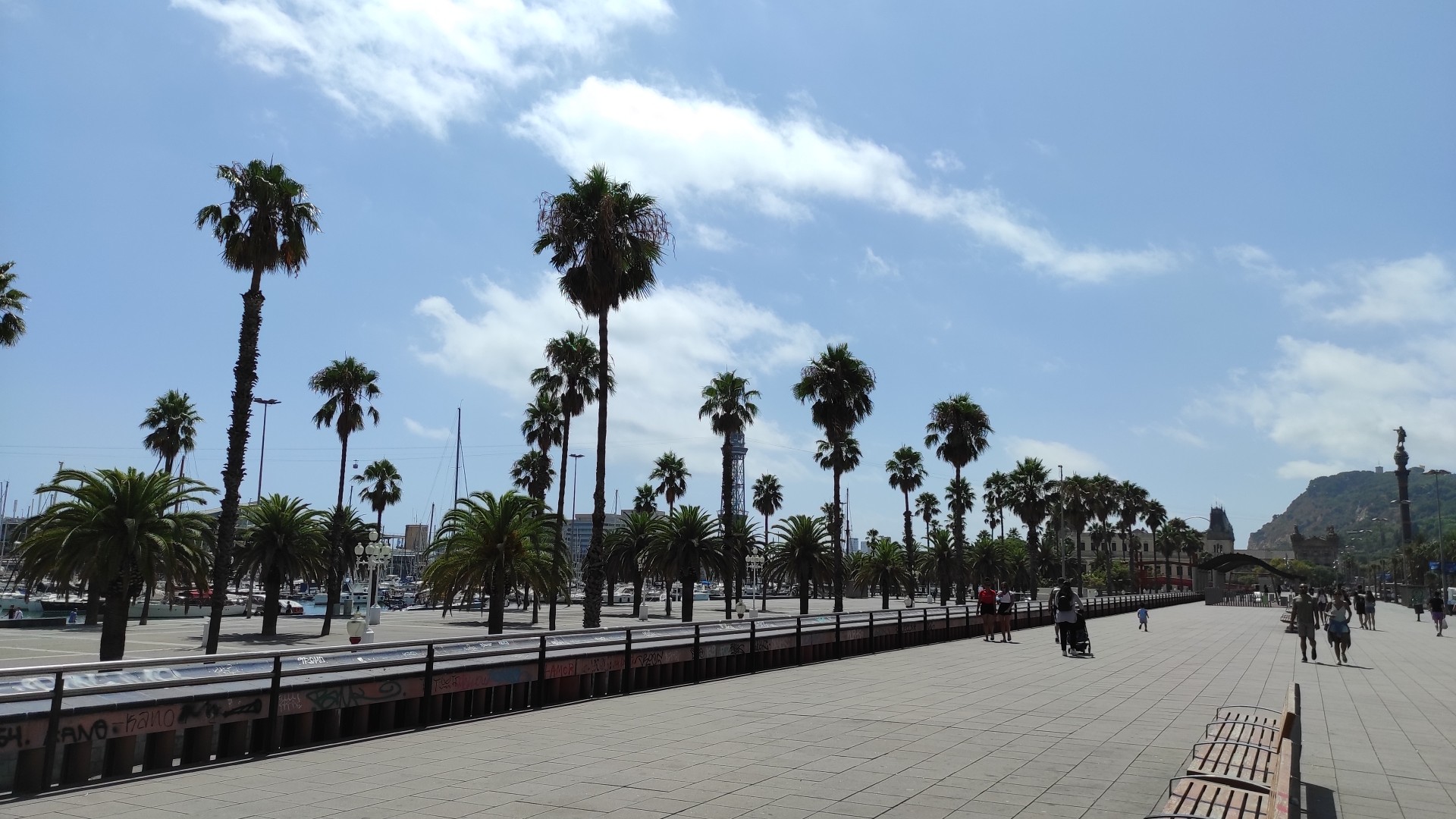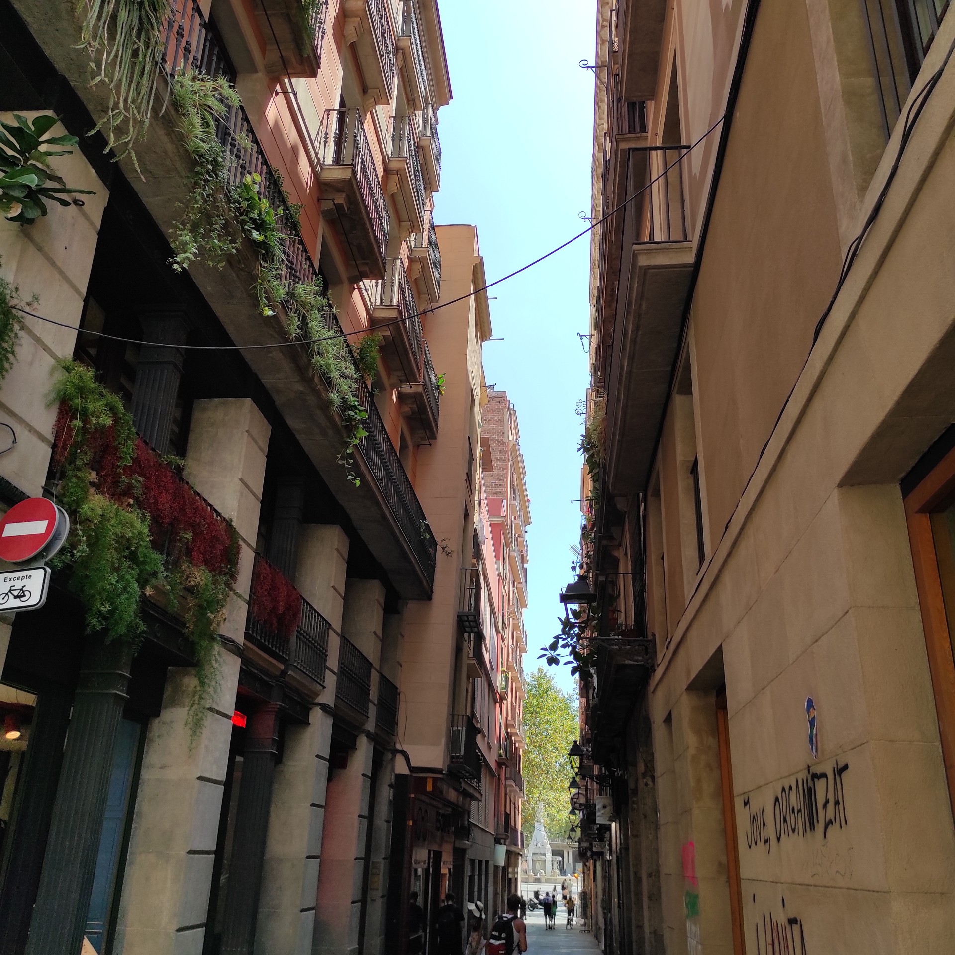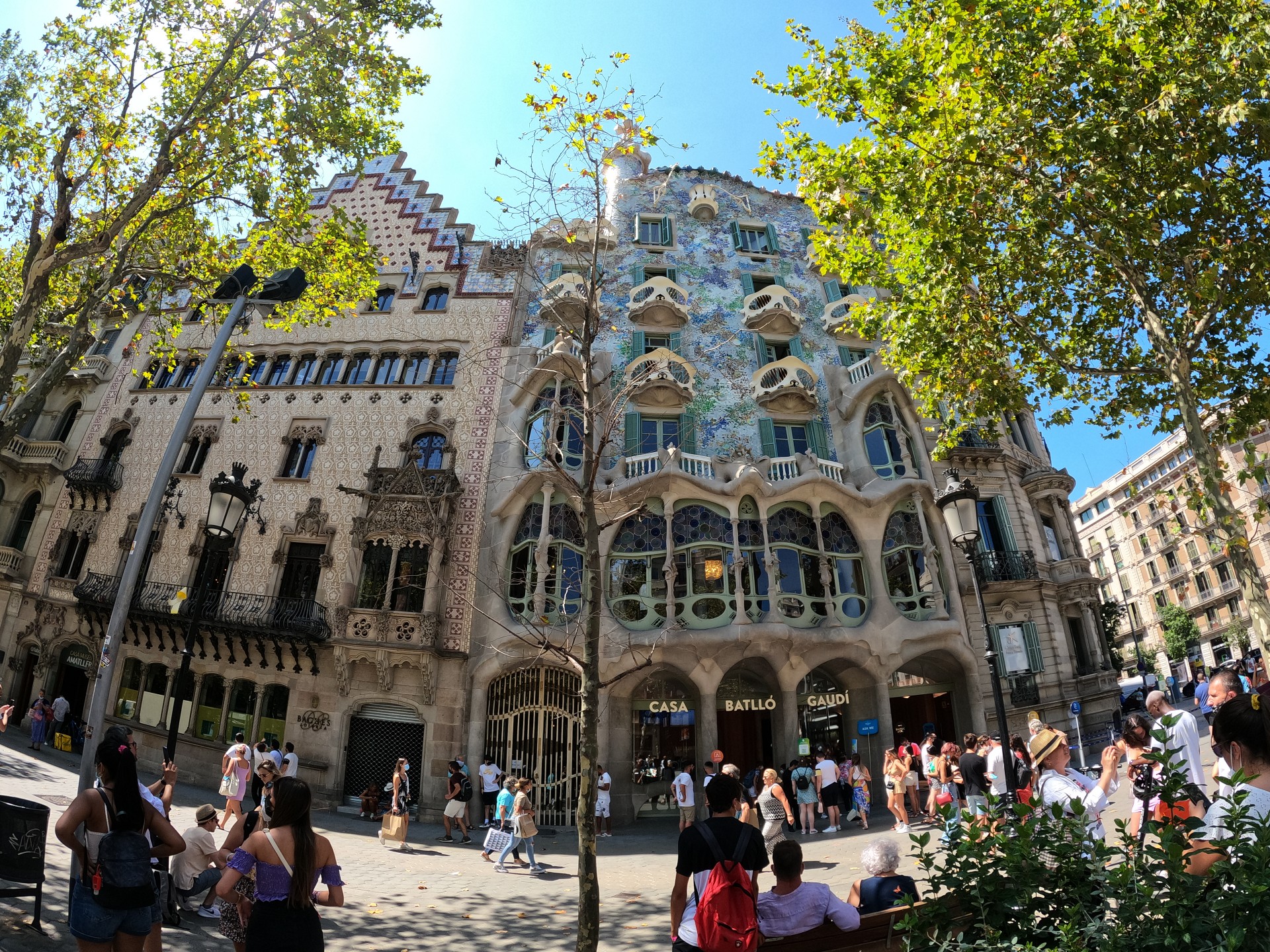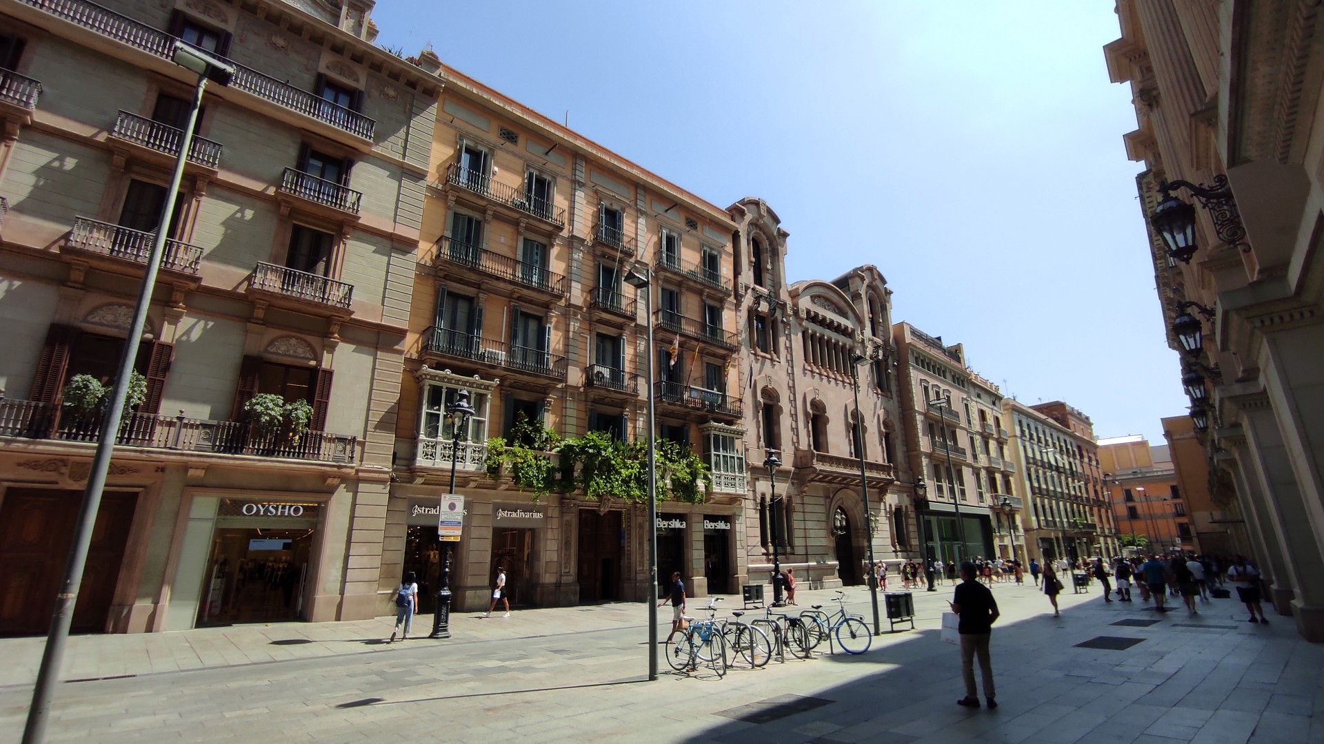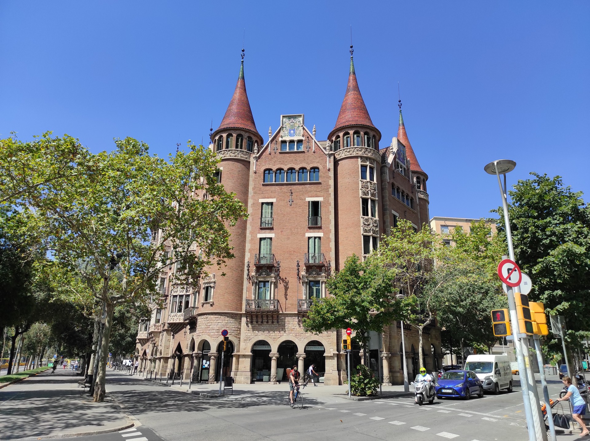 W Barcelonie co rusz są ładne kamienice i budynki. Pomiędzy nimi główne aleje są zaprojektowane takie szerokie, że jest oddech – przestrzeń pomiędzy nimi. Od kamienic po jednej stronie mamy szeroki chodnik, później dwa pasy dla samochodów w jednym kierunku, środkiem pasaż dla pieszych, rowerzystów (których najwięcej jest tutaj elektrycznych), elektrycznych hulajnóg, których tutaj jest naprawdę dużo. W pasażu jest bardzo dużo drzew, ławek i ciekawie wyglądające latarnie. Po drugiej stronie do przeciwległego rzędu kamienic mamy znów drogę dla samochodów z dwóch pasów ale w drugim kierunku i szeroki chodnik. Na parterze kamienic są niemal zawsze punkty usługowe, sklepiki, bary i restauracje. Ten schemat zabudowy był powielany niemal wszędzie gdzie się poruszałem. Mogłem więc w zależności od tego, skąd grzało słońce, iść pasażem lub odpowiednią stroną chodnika, by schronić się w cieniu.