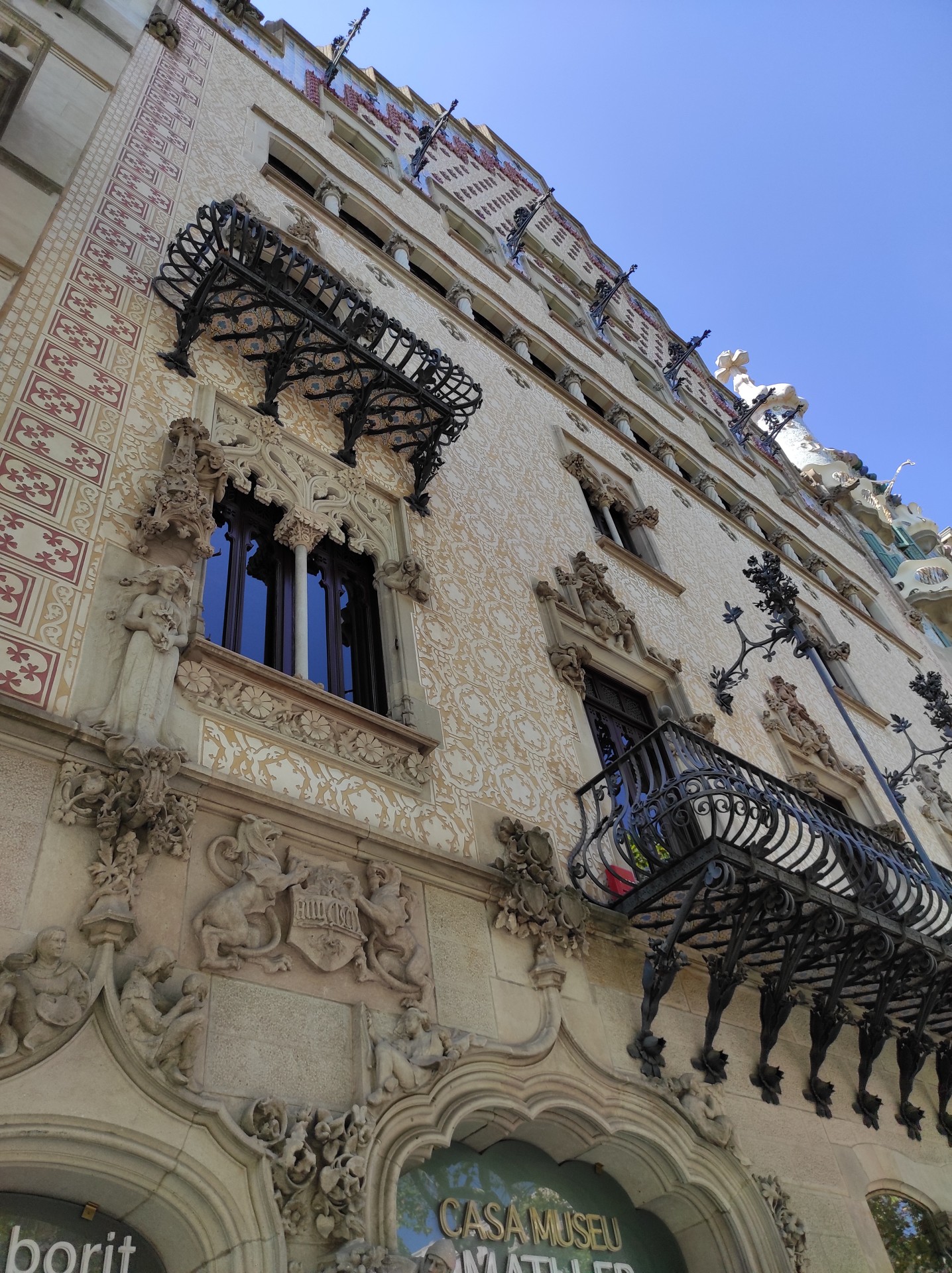Tak dotarłem do Casa Batllo, czyli fantazyjnej kamienicy o falistej fasadzie autorstwa Gaudiego. Jej dach pokryty jest dachówkami wyglądem przypominającym smocze łuski. Styl Gaudiego jest niepowtarzalny. Nie mamy tutaj kwadratów, geometrycznych regularnych kształtów lecz raczej bardziej zbliżone do naturalnych kształtów symetryczne ale nieregularności, obłości, wypukłości. Od linijki i ekierki raczej nie dałoby się tego zmajstrować! Piękność! A tuż obok stoi Casa Amatler w pięknie zdobionym neobarokowym stylu. Sprawia wrażenie, jakby miała kilkaset dobry lat. Przepięknie zdobiona elewacja i te detale na balkonach, płaskorzeźby! Cudo!