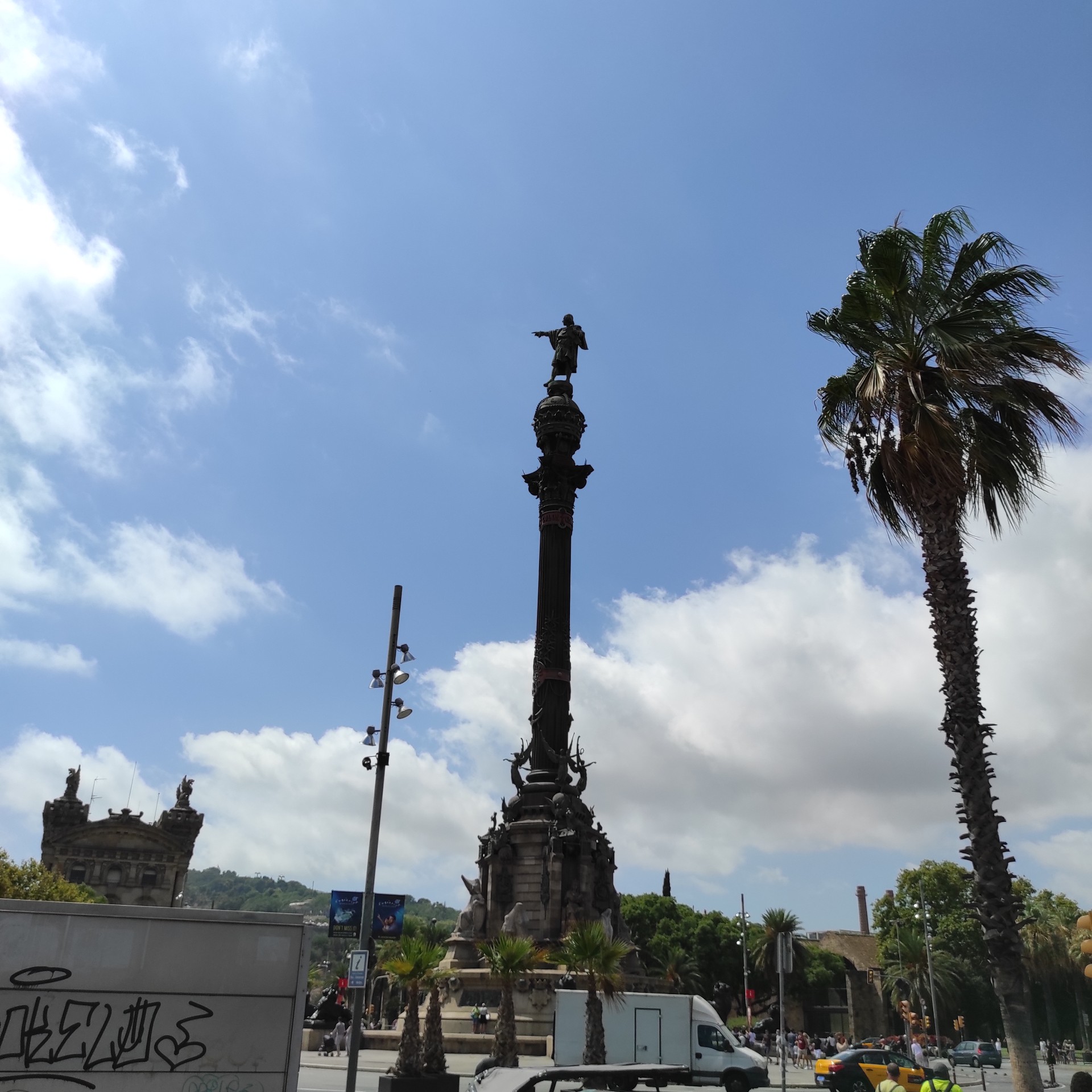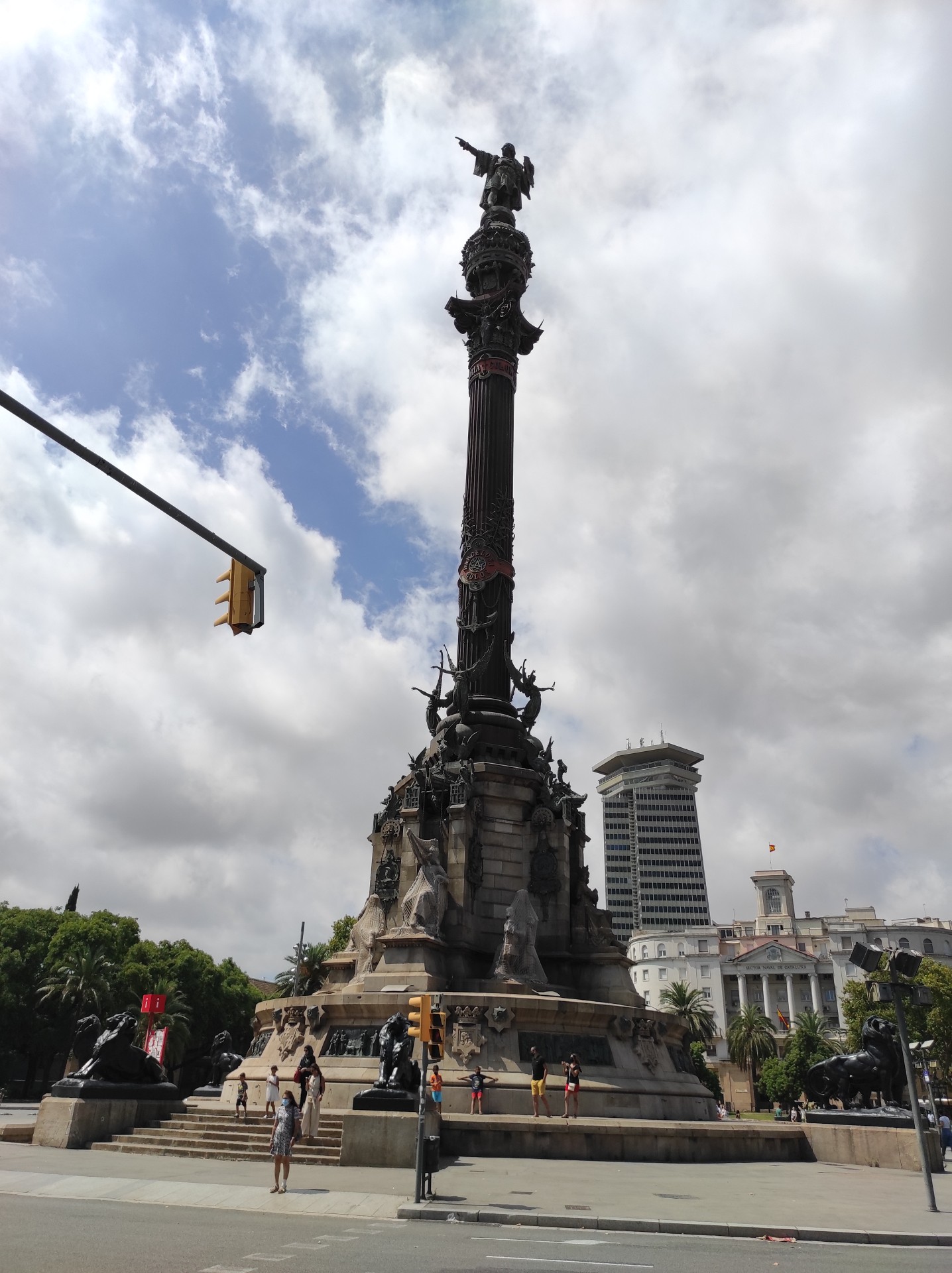 Gdy obróciłem się w lewo patrząc na Capitania General de Barcelona, zobaczyłem w oddali wielką kolumnę na której szczycie stał posąg człowieka wskazującego ręką gdzieś w dal – w kierunku zachodnim. Domyśliłem się już, kogo ten posąg przedstawia! Tak! To Krzysztof Kolumb. Pomnik Krzysztofa Kolumba w Barcelonie znajduje się na środku Placa Portal de la Pau obok Port Vell (Stary Port) i tutaj rozpoczyna się lub kończy najsłynniejszy deptak w Barcelonie, La Rambla. Obiekt został wzniesiony z okazji Wystawy Światowej, która odbyła się w stolicy Katalonii w 1888 roku. Zabytek ma upamiętniać miejsce powrotu Krzysztofa Kolumba z jego pierwszej wyprawy do Indii Zachodnich, która to jak wszyscy wiemy skończyła się odkryciem Nowego Świata – Ameryki. A że nadal trwają spory na temat pochodzenia Kolumba, to Hiszpanie uważają, że był Hiszpanem, zaś Włosi podnoszą, że pochodził z rodziny mieszkającej w Genui i ponoć tam się urodził, czyli Włoch! Jest nadzieja że spory zakończy badanie DNA…