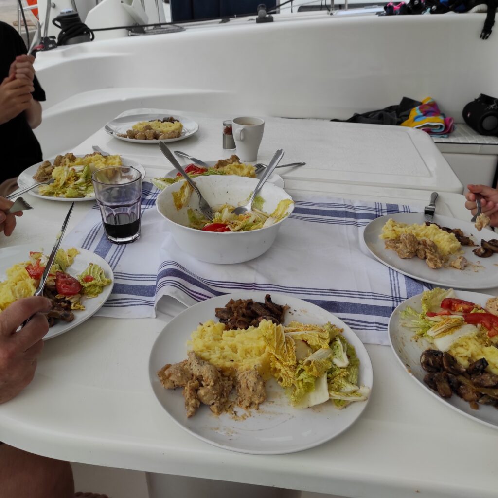 A tutaj niespodzianka! Nasz kochany Kapitan Mariusz nie dość że jest barwną i charakterną postacią i świetnym skipperem, to jeszcze doskonałym kucharzem! A kucharz na jachcie, to Kuk! Czyli to nasz Kapitan Cook! Podczas naszej nieobecności, wysprzątał lodówki i zrobił przegląd zapasów. Kupił ziemniaki (które wie, gdzie znaleźć) i wyczarował nam przepyszną kolację z indyka, pieczarek, cebulki, pysznych (ale tak wyjątkowo dobrych) ziemniaków. Byliśmy zachwyceni! No to się Szwedzi po obu stronach naszego katamaranu musieli nadziwić, co my tacy entuzjastyczni i śpiewający. Było pysznie i bardzo miło! Lepiej niż w restauracji – naprawdę! To dla mnie niesamowite, jaki to talent, by jak to Kapitan Cook – Mariusz powiedział, „gotować intuicyjnie z tego co jest dostępne i łączyć smaki”. Indyk był w sosie do którego Mariusz użył między innymi serka do smarowania pieczywa Philadelphia!