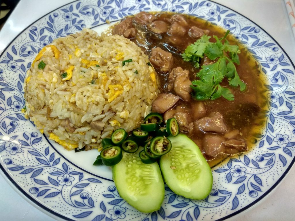 Chinatown wywarła na mnie dobre wrażenie. Gwar, dużo ludzi, garkuchnia, motokuchnia co krok. Mnóstwo wielkich kolorowych neonów z chińskimi napisami. No jakbyśmy się teleportowali do HongKongu! Tak trafiliśmy do restauracji Hoon Kuang, której moją recenzję możecie przeczytać tutaj. Zjadłem tutaj Ju Rong Jee, czyli smażony ryż z grillowaną wieprzowiną w sosie z kęskami kurczaka i szczerze mówiąc już z perspektywy wszystkich późniejszych miejsc i potraw, niespecjalnie mnie to zachwyciło. Ale jako miejsce gdzie można usiąść pod dachem, gdzie jest czysto i nie trzeba patrzeć na szczury bijące się o resztki – to jest OK. Za całość jedzenia z colą zero zapłaciliśmy 180 Bahtów, a więc niemało.