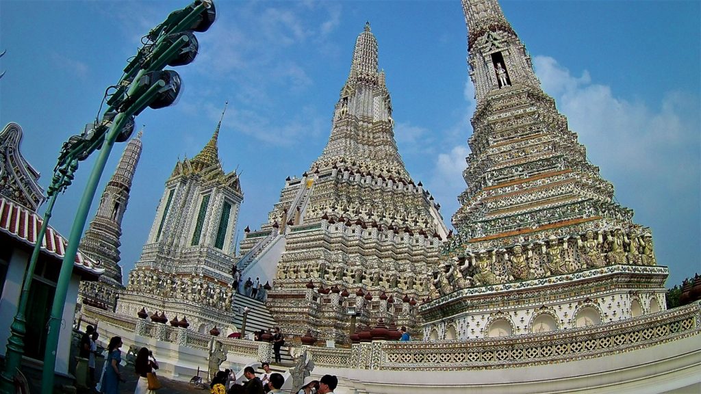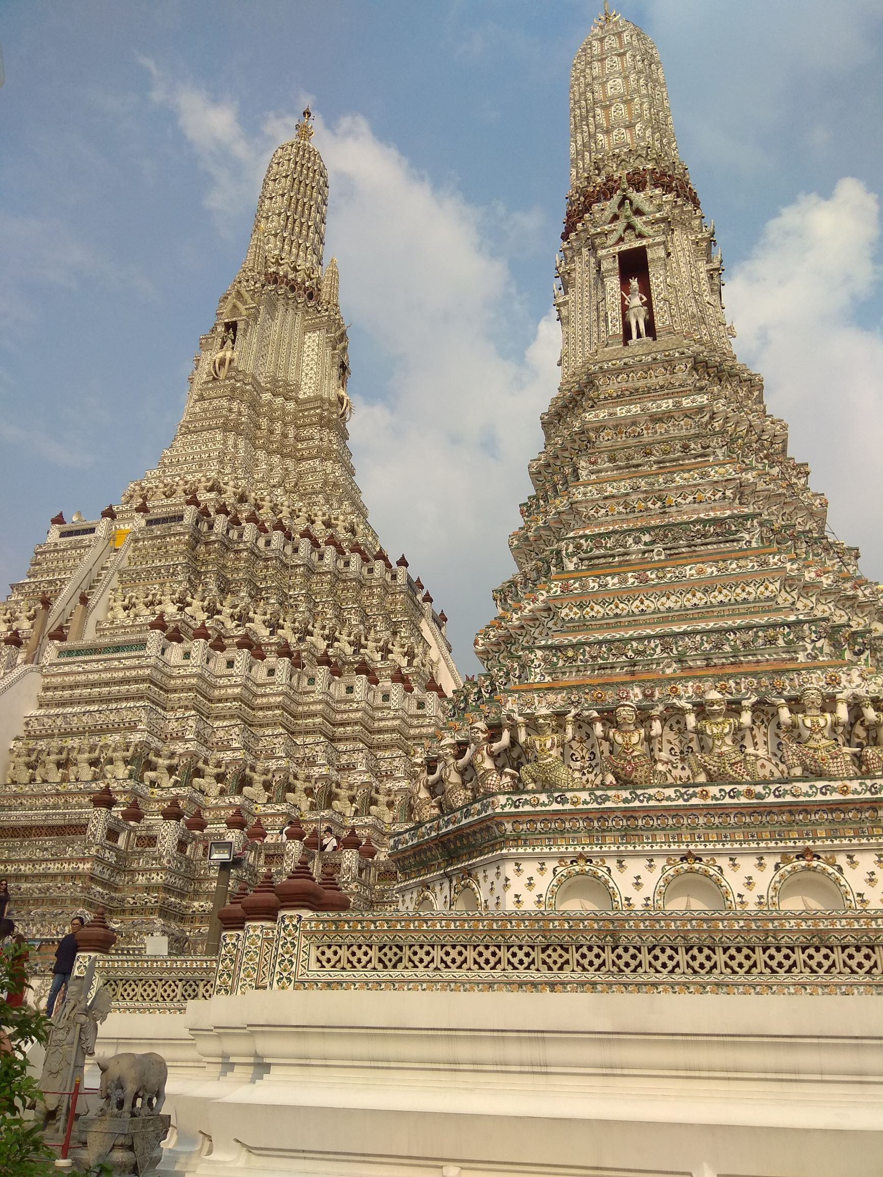 Gdy wchodziliśmy na teren tej Świątyni nie było świtu. Słońce chyliło się już ku zachodowi. Mimo to najwyższy prang, czyli przypominający kolbę kukurydzy główny budynek świątyni i cztery mniejsze – wszystkie wyłożone ozdobami z białej ceramiki wyglądały przepięknie! Cała świątynia istniała jeszcze przed założeniem na tych terenach miasta, które później przyjęło nazwę Bangkok. Świątynia jest zbudowana w stylu khmerskim, dlatego jej 5 prangów symbolizuje 5 świętych gór Khmerów, które były domem dla bogów. Według khmerskiej, hinduskiej i buddyjskiej kosmologii.