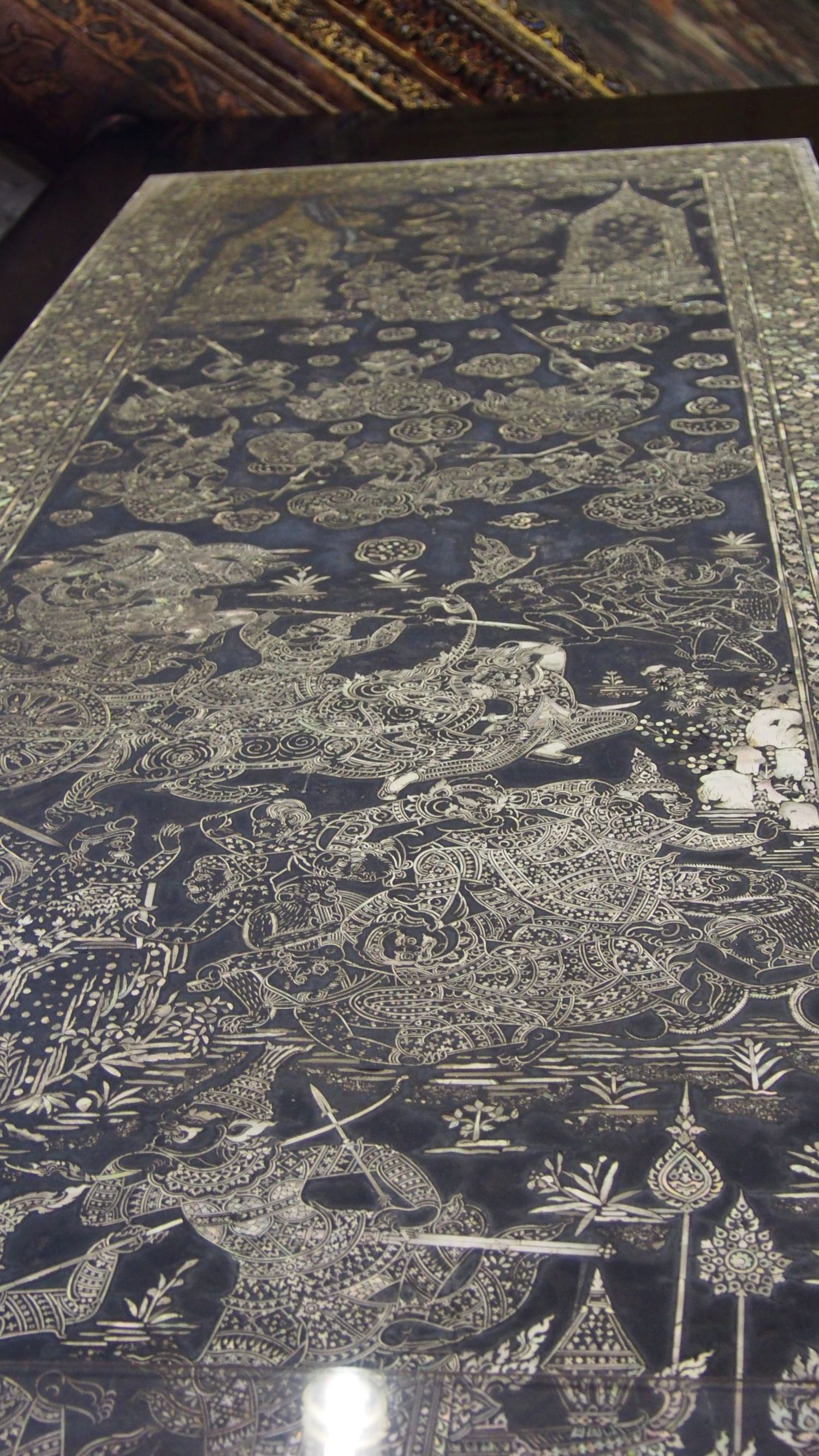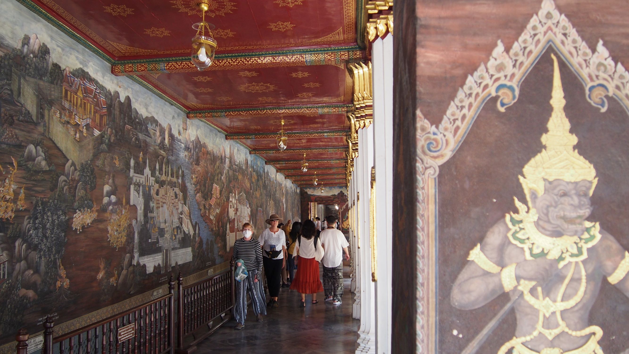 W Świątyni Wat Pho największe wrażenie wywarły na mnie malunki na ścianach okalających posąg odpoczywającego Buddy. Musiało to wyglądać ciekawie, gdyż w tym całym tłumie turystów podczas gdy wszyscy starali się podejść jak najbliżej olbrzymiego złotego leżącego sobie na boku Buddy i zrobić najlepiej selfie chociaż z częścią jego sylwetki bądź przynajmniej ze stopami, ja z rozdziawioną gębą podziwiałem po przeciwnej stronie całego ruchu turystów ściany na których z pietyzmem namalowane były scenki rodzajowe z tajskiej historii. To zamiłowanie do szczegółów i różnych najdrobniejszych detali wywarło na mnie ogromne wrażenie. Ściany były wysokie na jakieś może 10m i całe były zapełnione drobnymi postaciami. Te malunki były wykonane naprawdę małymi pędzelkami. Coś niesamowitego! Ogrom pracy. Nawet nie jestem w stanie sobie wyobrazić ile osób i w jakim czasie musiało to wykonywać, by zapełnić wnętrze budowli tymi malowidłami. Generalnie detale zdobień na Świątyniach w Tajlandii to coś, co swoją misternością, bogactwem i oryginalnością po prostu powoduje niesamowity zachwyt. Każde drzwi, wykończenia dachów, obramowanie okien jest ozdobione z tym przepychem.