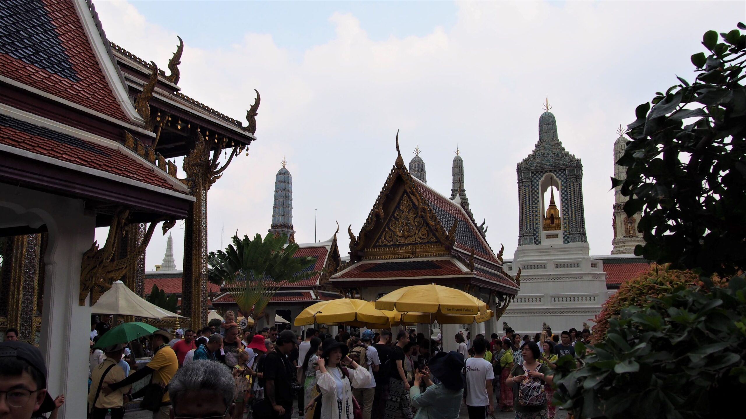 Teren Pałacu Królewskiego jest ochraniany przez sporą ilość wojskowych obu płci i nie mniejszą ilość ochrony. Na terenie samego Pałacu zastaliśmy naprawdę imponujący tłum turystów i to nie wyłącznie obcokrajowców (choć nie bardzo rozróżniam Tajów od Chińczyków) ale i samych Tajów było naprawdę dużo. Spowodowane jest to tym, że do Pałacu Królewskiego z całej Tajlandii przybywają wycieczki, by złożyć hołd Rodzinie Królewskiej, zwłaszcza, że niedawno, w 2016 roku zmarł uwielbiany przez Tajów Król Bhumibol Adulyadej. Władał on Tajlandią od 1946 roku! Od 1982 roku był najdłużej panującym nieprzerwanie władcą na Świecie