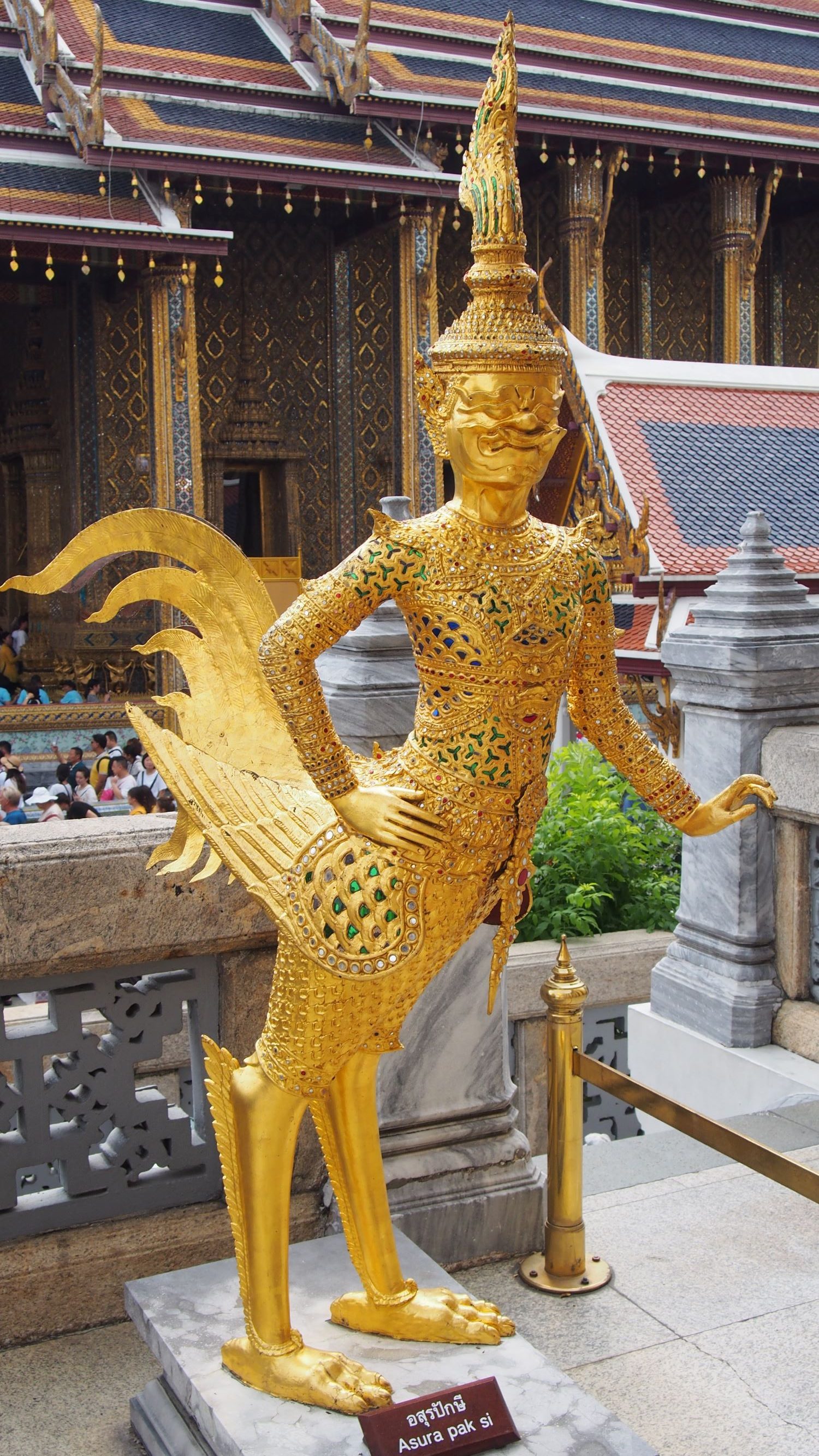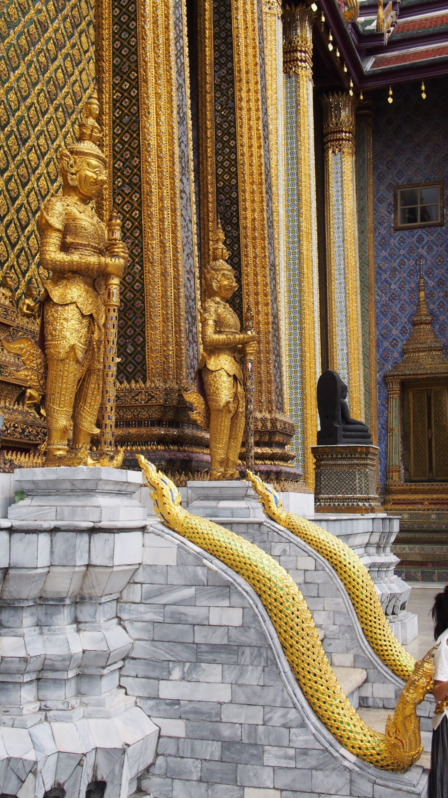 Teren Pałacu Królewskiego jest otoczony ponad 2 km białych murów (których ponad połowę musieliśmy obejść, żeby tu wejść 🙂 Część świątynna ze szmaragdowym Buddą jest w północno- wschodniej części. Teren jest rozległy a do zwiedzania nie są dostępne wszystkie budowle. Co prawda nie jest to spowodowane obecnością Króla, jego żon i dzieci w tych budynkach, bo już od dawna rodzina królewska przeniosła się w inne miejsce – do Pałacu Dusit. Można tutaj obejrzeć wystawę narodowej sztuki tajskiej, można również (i to w ramach tego samego biletu wejścia) obejrzeć teatr maskowy – tradycyjny tajski. My niestety zrezygnowaliśmy z tego, bowiem musielibyśmy czekać ponad godzinę na kolejny spektakl a i tak nie mieliśmy pewności, czy uda nam się wejść, bo nie mieliśmy zrobionej rezerwacji i mogło dla nas zabraknąć miejsca. Przy takich tłumach w jakich tu byliśmy, nie było to wcale nieprawdopodobne.