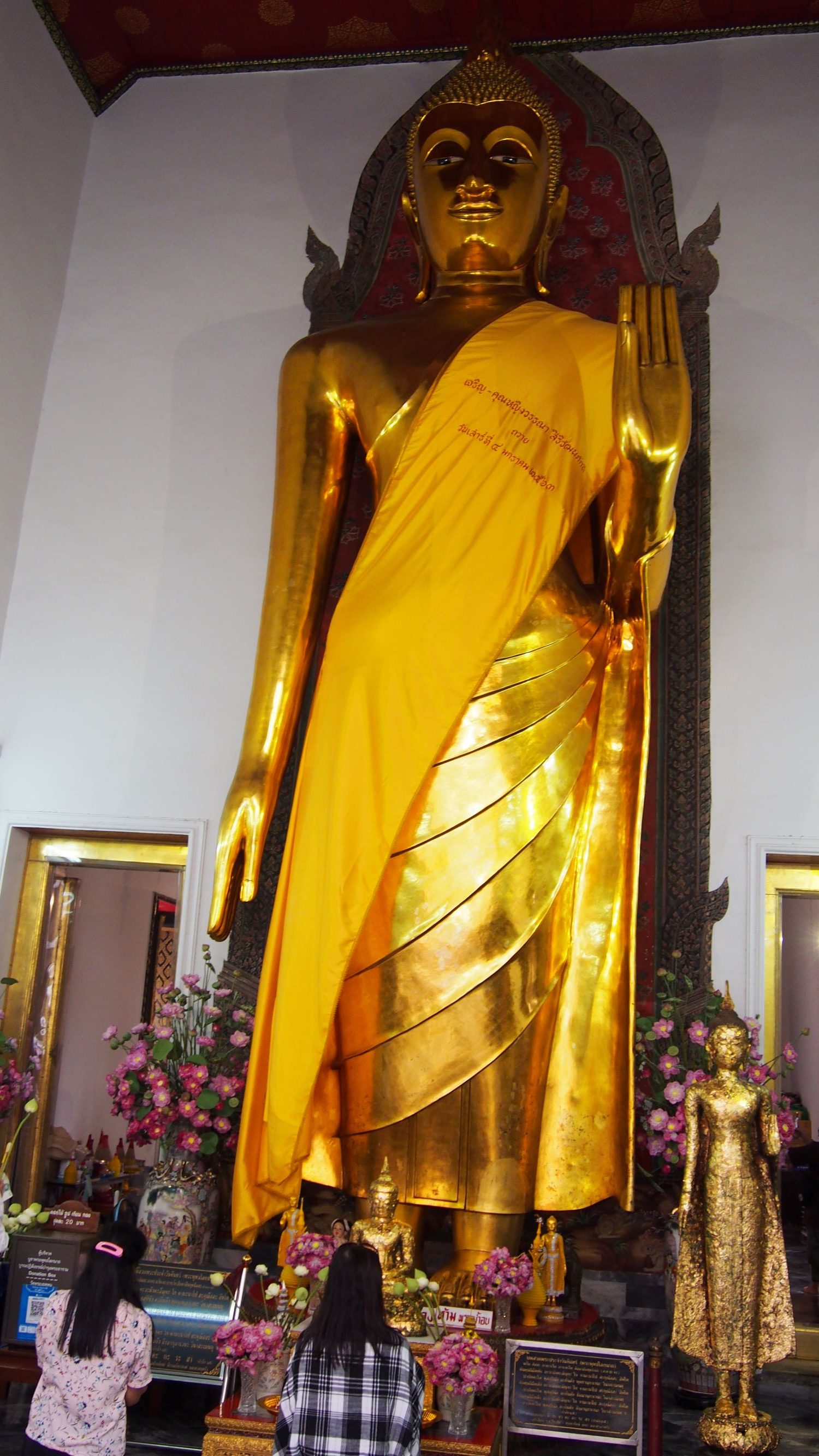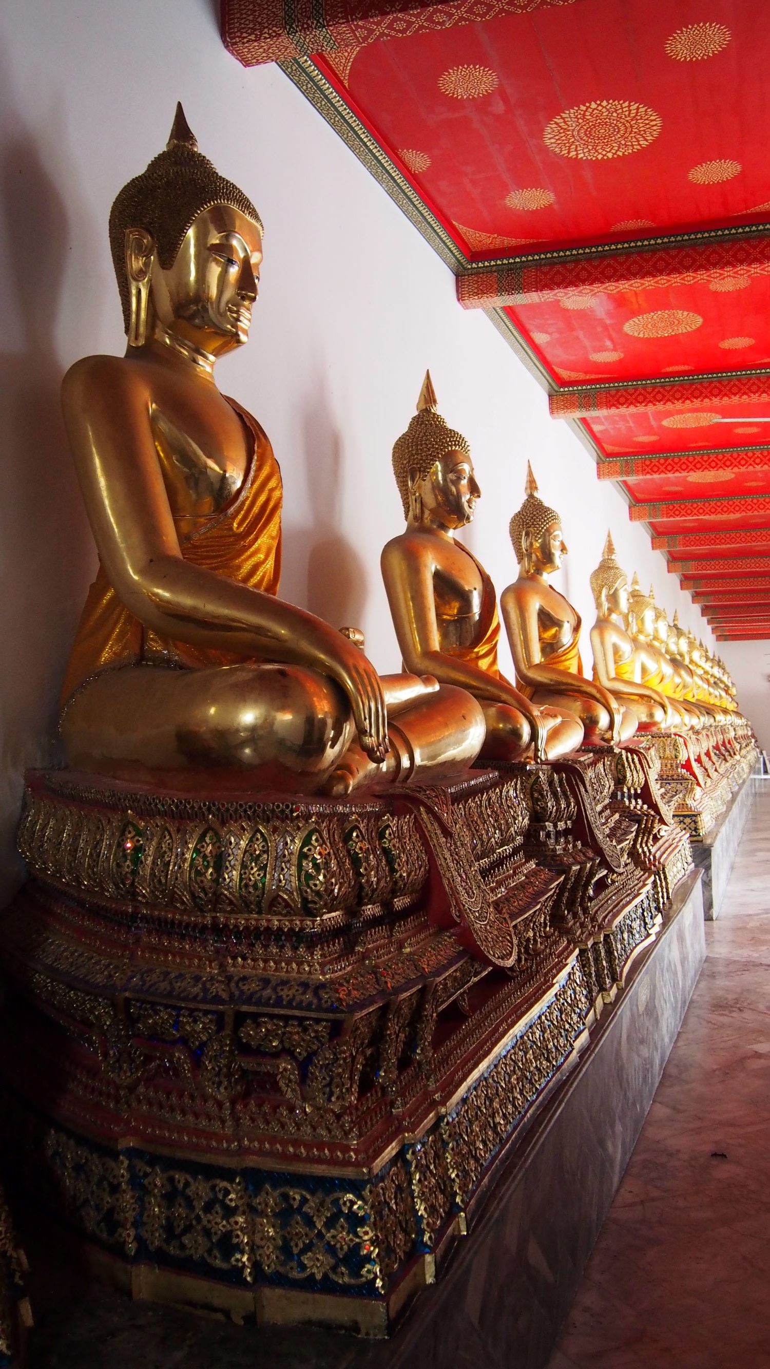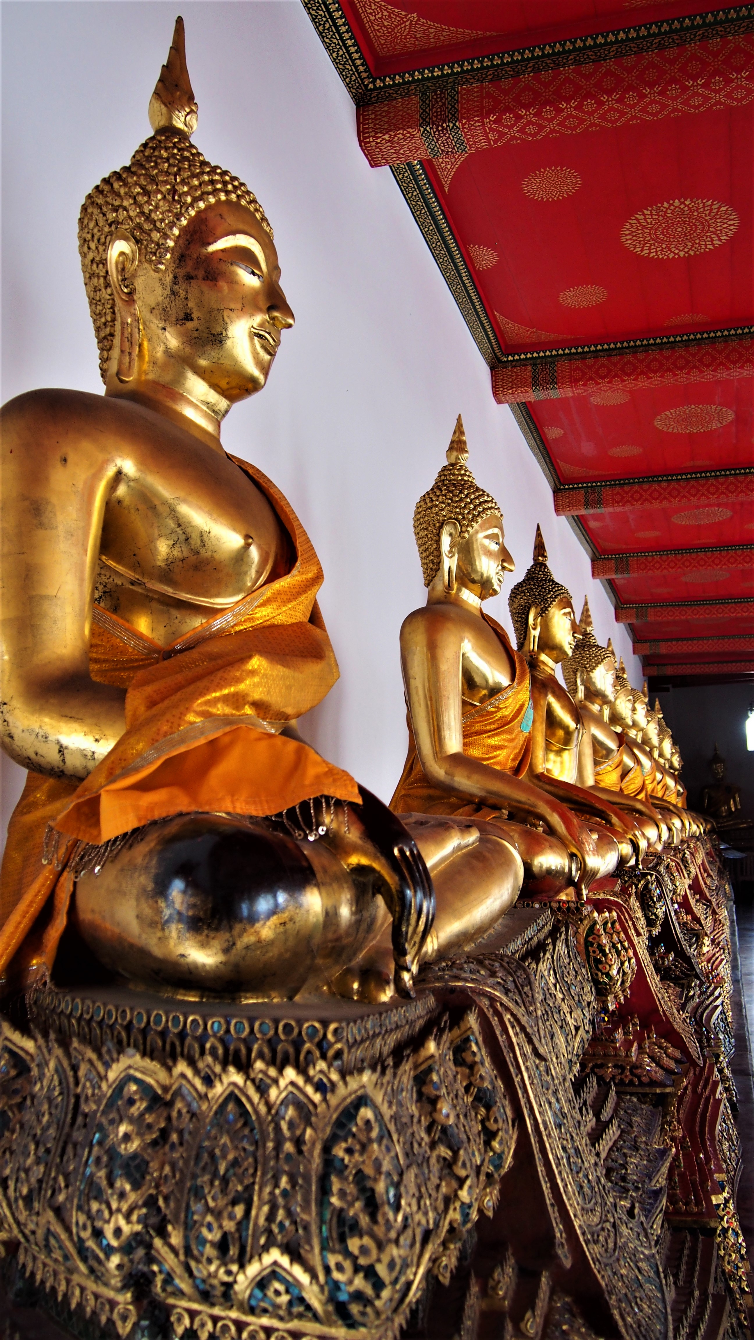 Złoty posąg odpoczywającego Buddy robi niesamowite wrażenie głównie za sprawą jego rozmiarów. To prawdziwy kolos, który zajmuje niemal całą dostępną przestrzeń budynku w którym się znajduje. Jest tak wielki, że ciężko zrobić zdjęcie, by ująć go w całej okazałości! Ruch turystów jest puszczony bokiem, więc całe to towarzystwo kotłuje się pomiędzy kolumnami, by dostać się do jednego z 6 fragmentów złotego Buddy pomiędzy tymi kolumnami właśnie i ustrzelić sobie zdjęcie, selfiaczka, czy co tam chcą.
