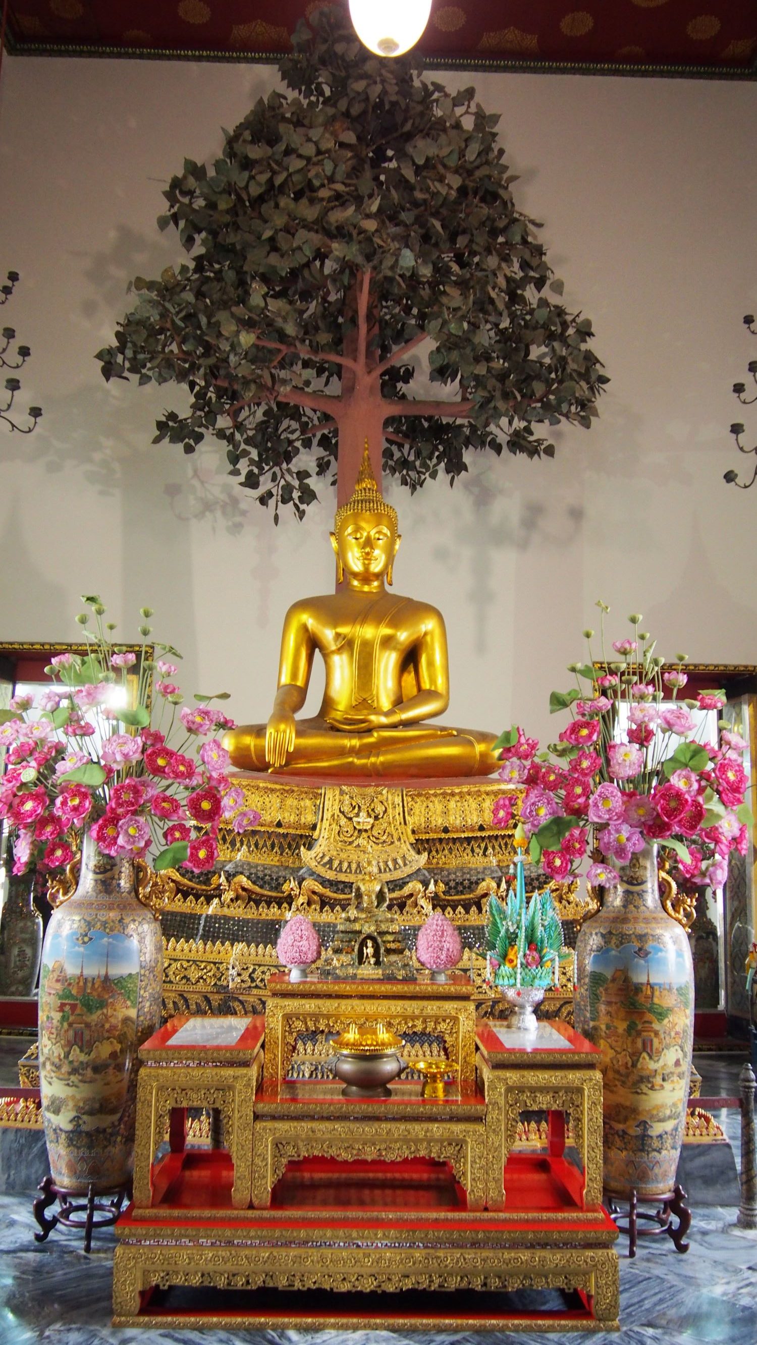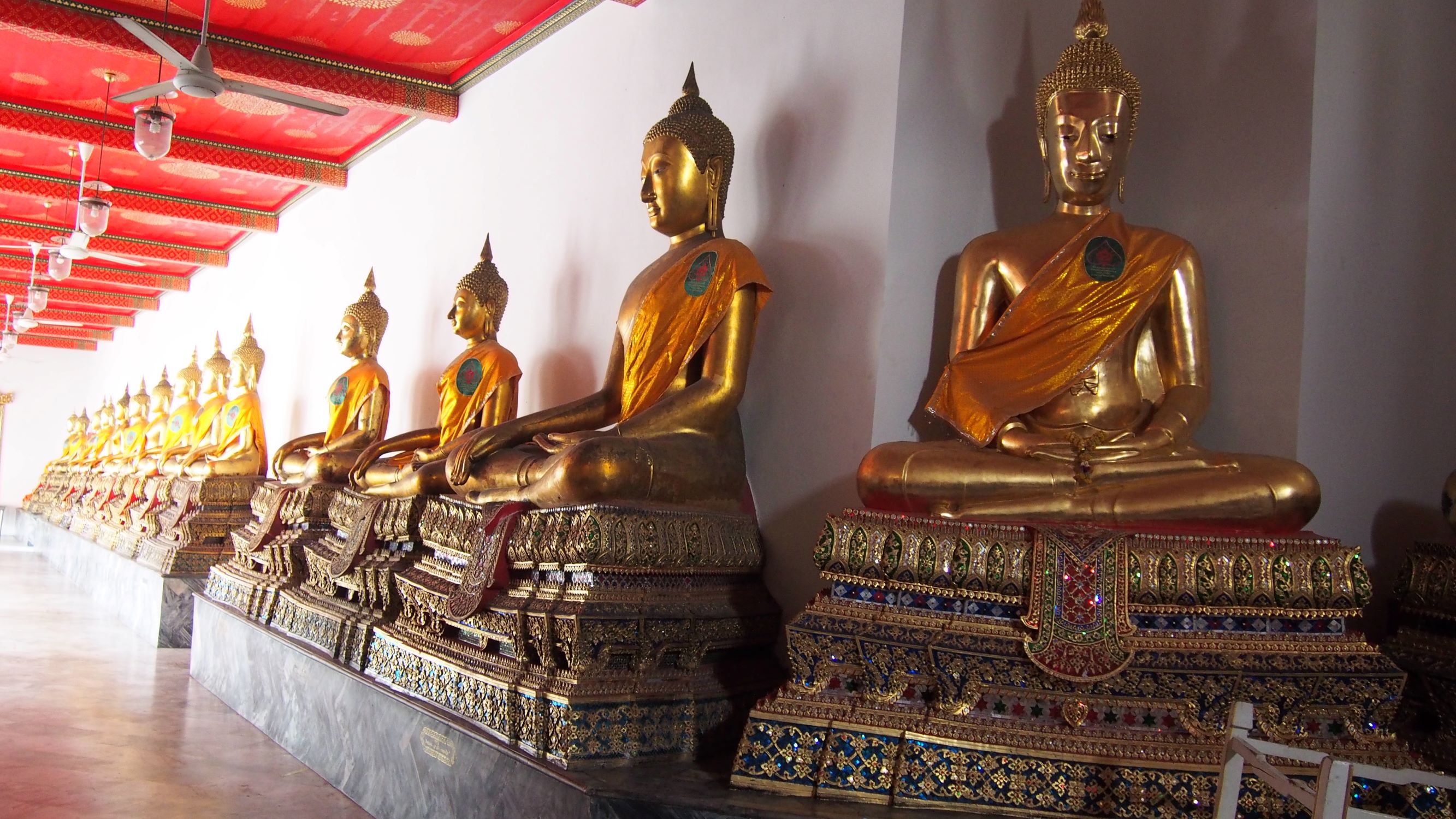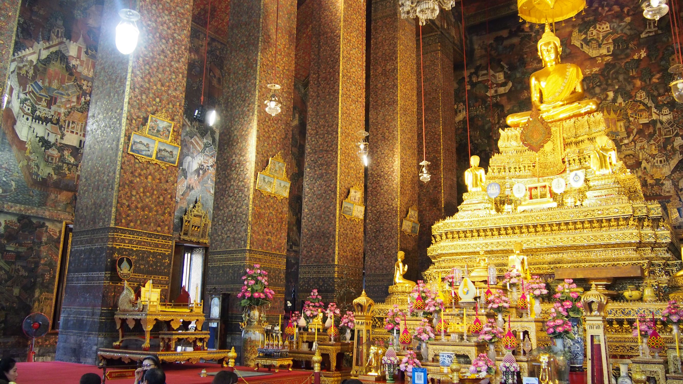 Złoty posąg odpoczywającego Buddy robi niesamowite wrażenie głównie za sprawą jego rozmiarów. To prawdziwy kolos, który zajmuje niemal całą dostępną przestrzeń budynku w którym się znajduje. Jest tak wielki, że ciężko zrobić zdjęcie, by ująć go w całej okazałości! Ruch turystów jest puszczony bokiem, więc całe to towarzystwo kotłuje się pomiędzy kolumnami, by dostać się do jednego z 6 fragmentów złotego Buddy pomiędzy tymi kolumnami właśnie i ustrzelić sobie zdjęcie, selfiaczka, czy co tam chcą.