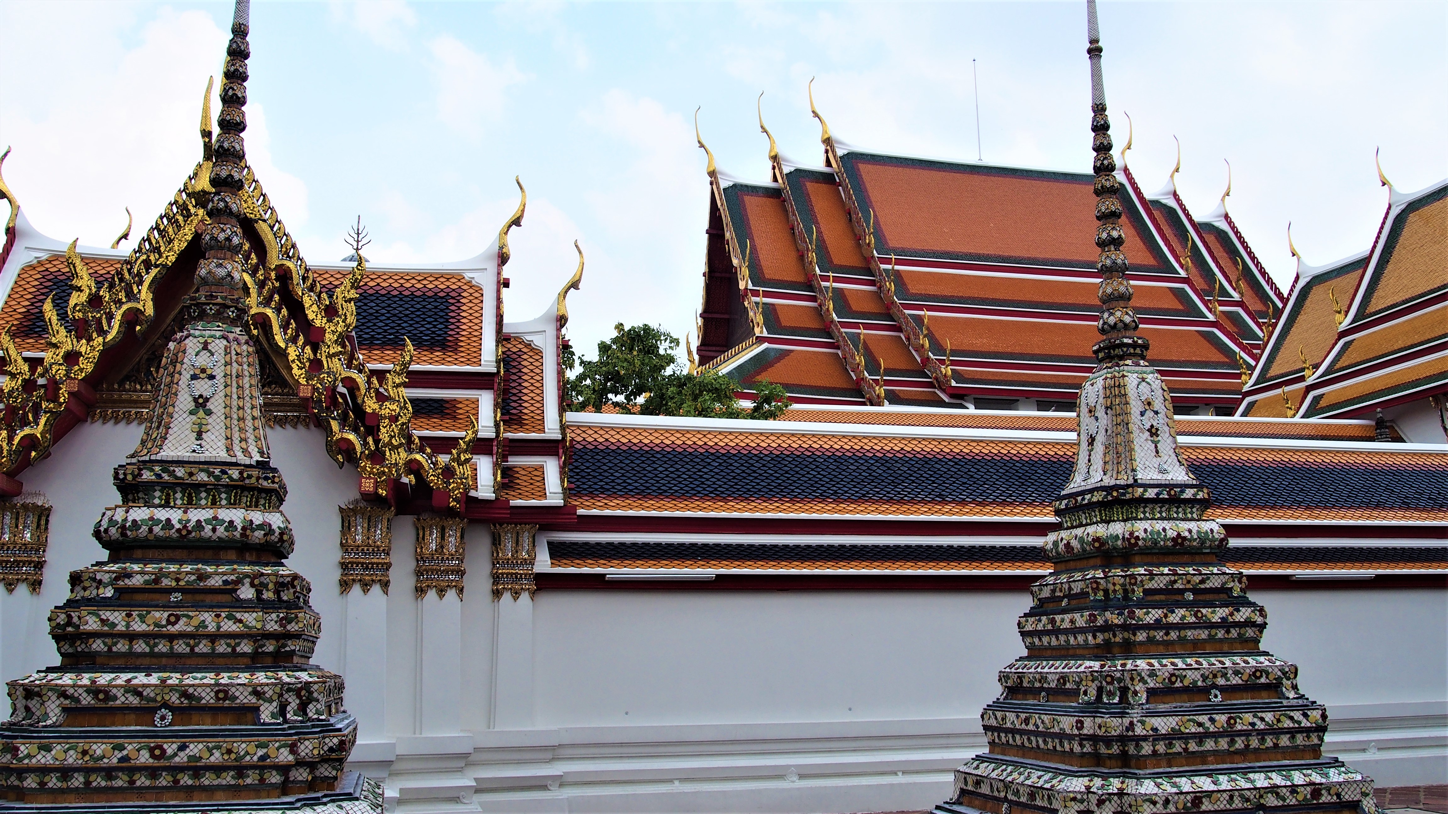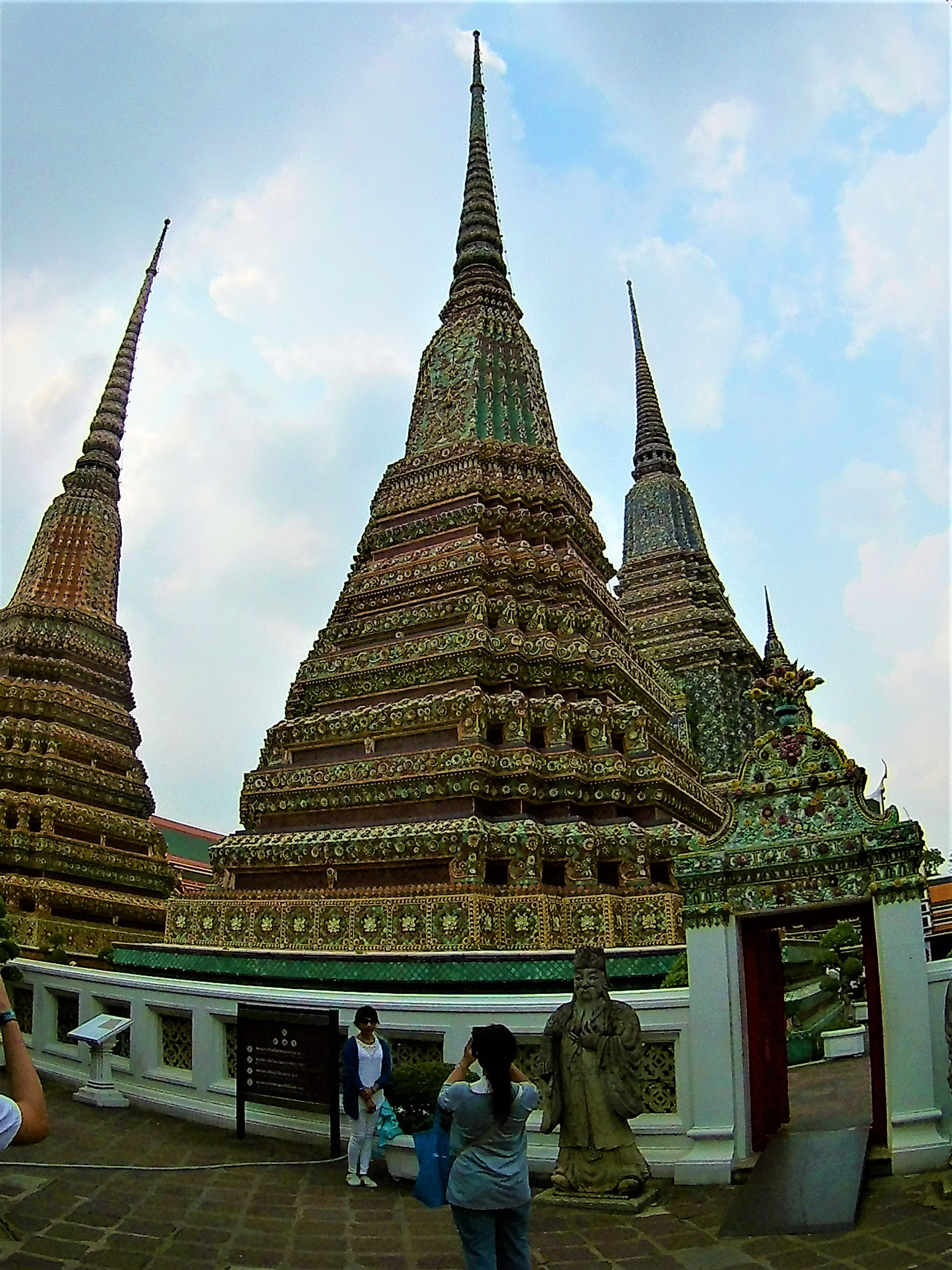 Ale Wat Pho to nie tylko sam posąg złotego odpoczywającego uśmiechniętego Buddy, ale również cały kompleks budynków pięknie zdobionych, stup niezgorzej udekorowanych w misterne drobne zdobienia oraz różnych pomników. Na przykład mnichów w różnych wymyślnych pozach (pewnie jakaś joga), czy też demonów strzegących wejść do Świątyni.